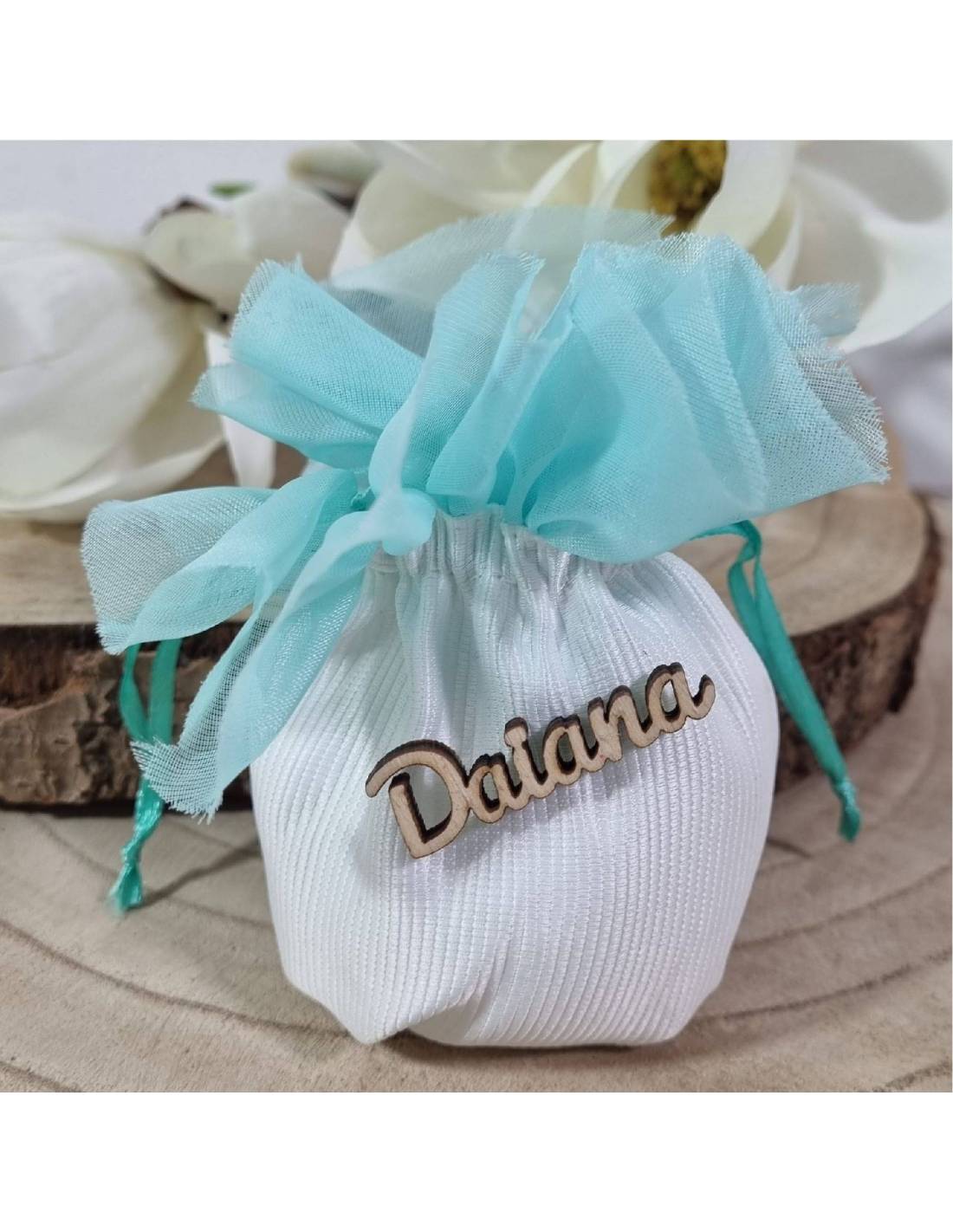 Sacchetto portaconfetti in stoffa bianca e tulle tiffany con il nome in legno della festeggiata.