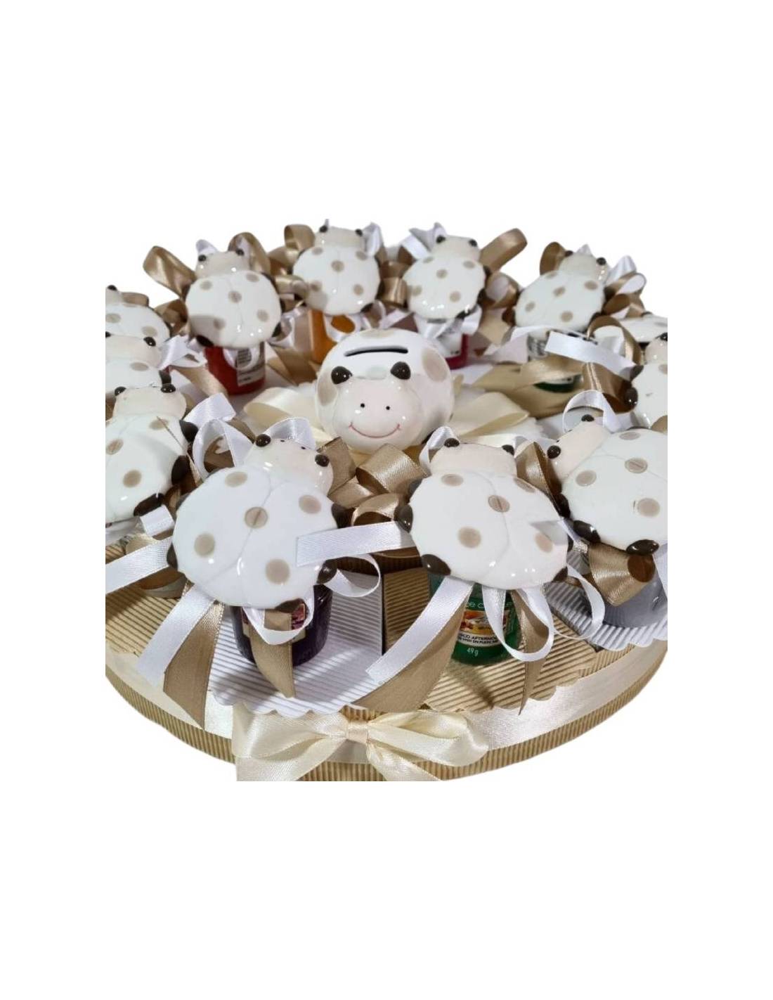 Puoi confezionare con le tue mani la torta bomboniere candele profumate in quanto la struttura è montata e decorata con nastri, basterà chiudere le fette e attaccare gli oggetti (coccinelle con fiocco già assemblato pronto da attaccare) sulle candele.