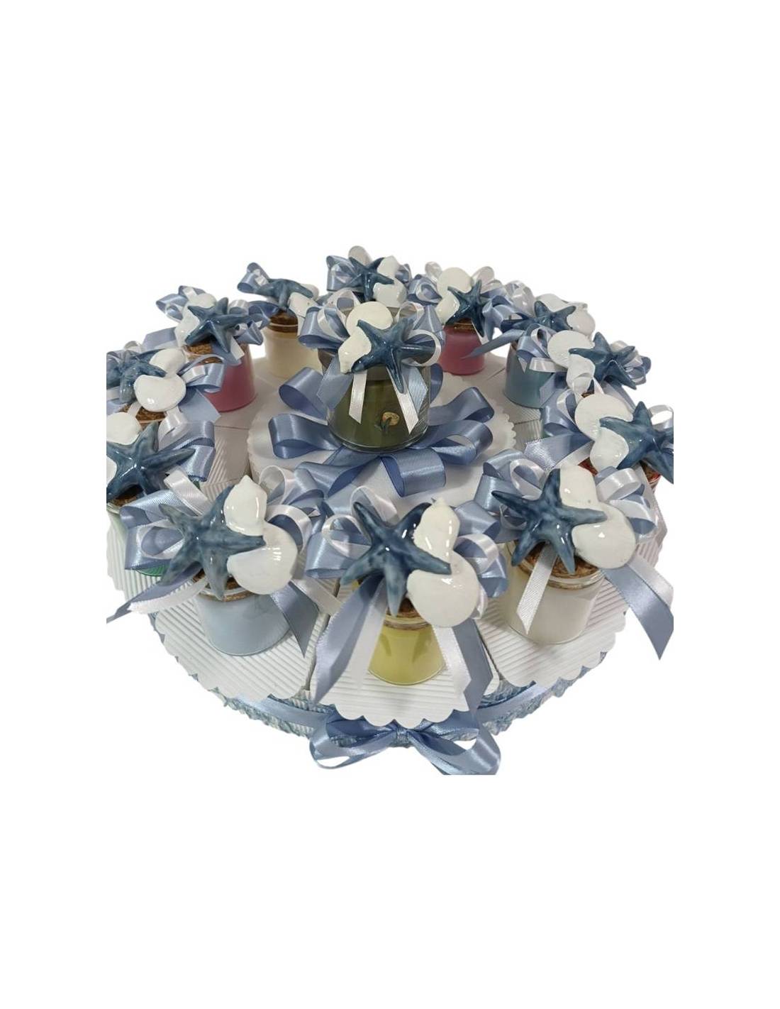 Bomboniere yankee candle confezionati con calamite in ceramica a forma di stella marina blu e conchiglie bianche con confezione a torta bomboniera.