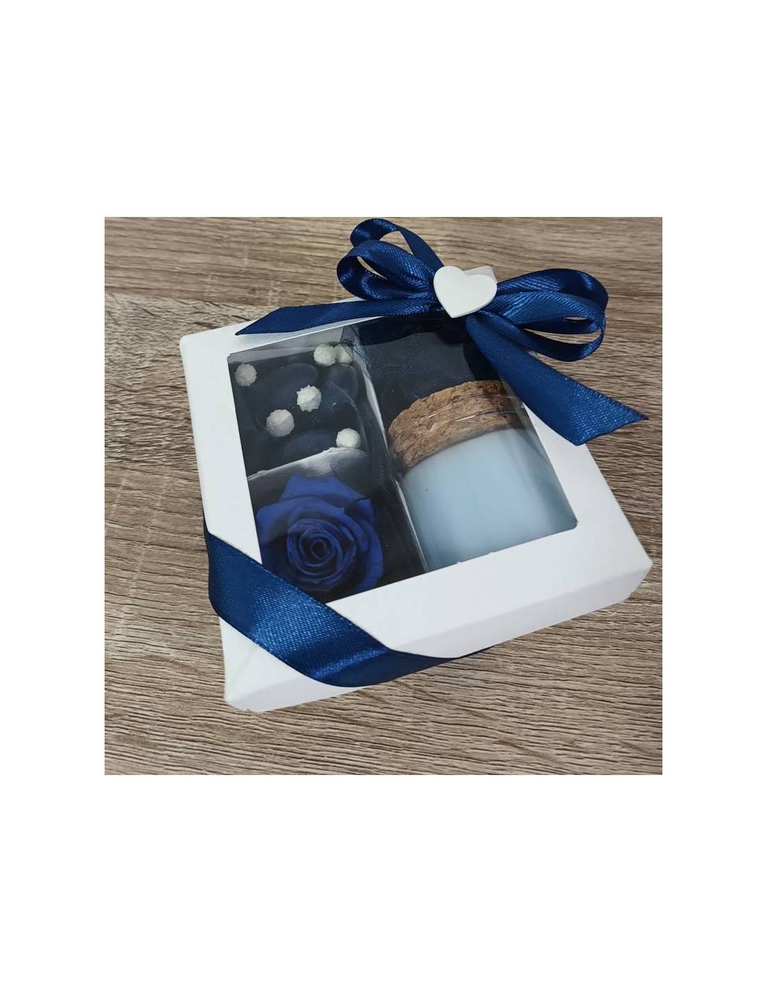 La promozione comprende la candela, la rosa vera blu, 5 confetti con zuccherini, il nastro, cuore bianco e bigliettino.