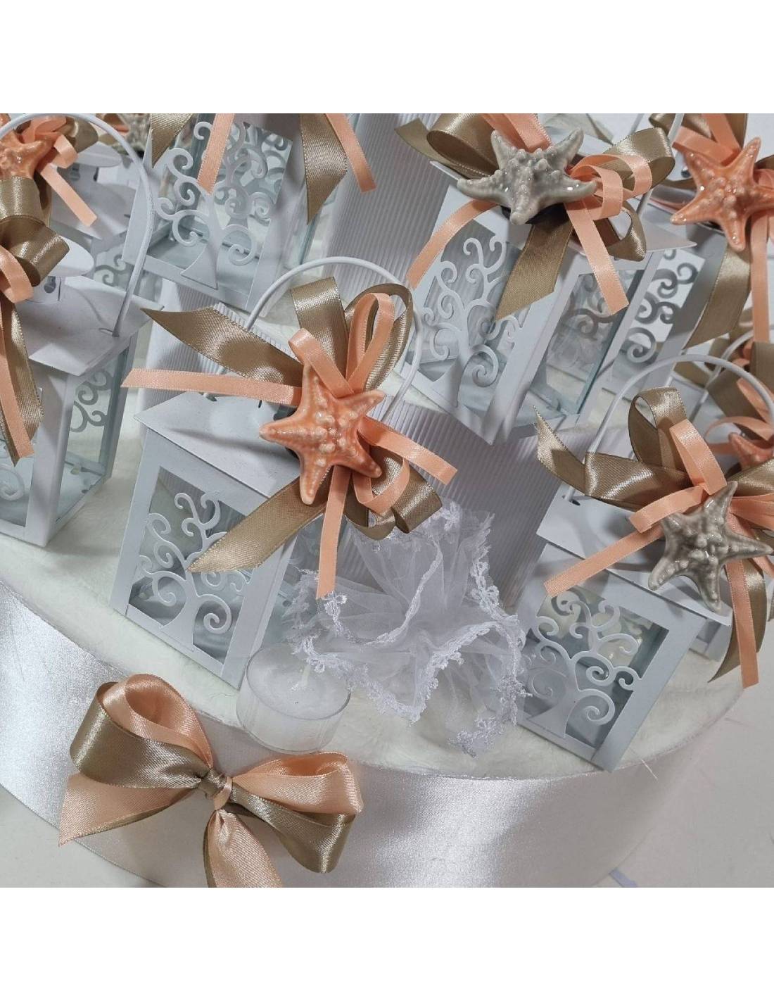 Le lanterne bomboniere candele sono in metallo di colore bianco con stelle marine beige e pesco.