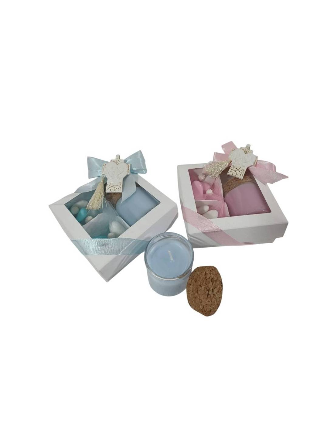 Vasetto candela per Battesimo femminuccia in vetro con cera yankee candle confezionata in scatola a vista con confetti abbinati.
