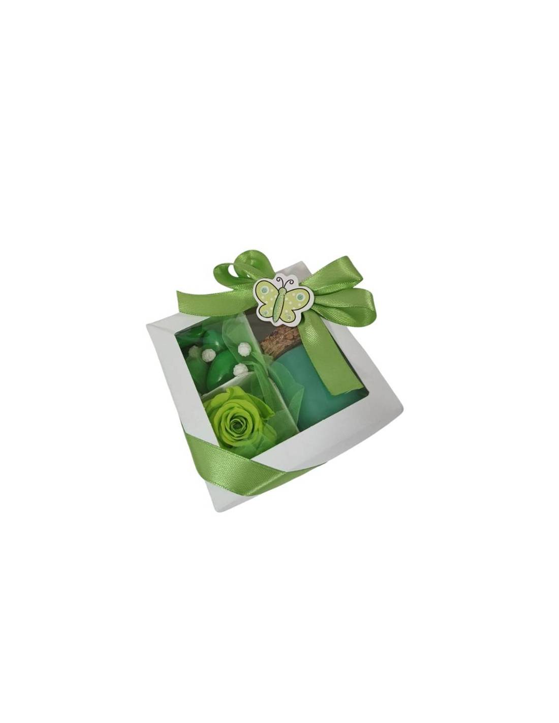 Bomboniera Yankee Candle nella scatola a vista tutto in coordinato con farfallina. Nel prezzo è compreso la rosa, la candela, confetti e mimose, veli, nastro, farfalla e bigliettino, tutto da confezionare.