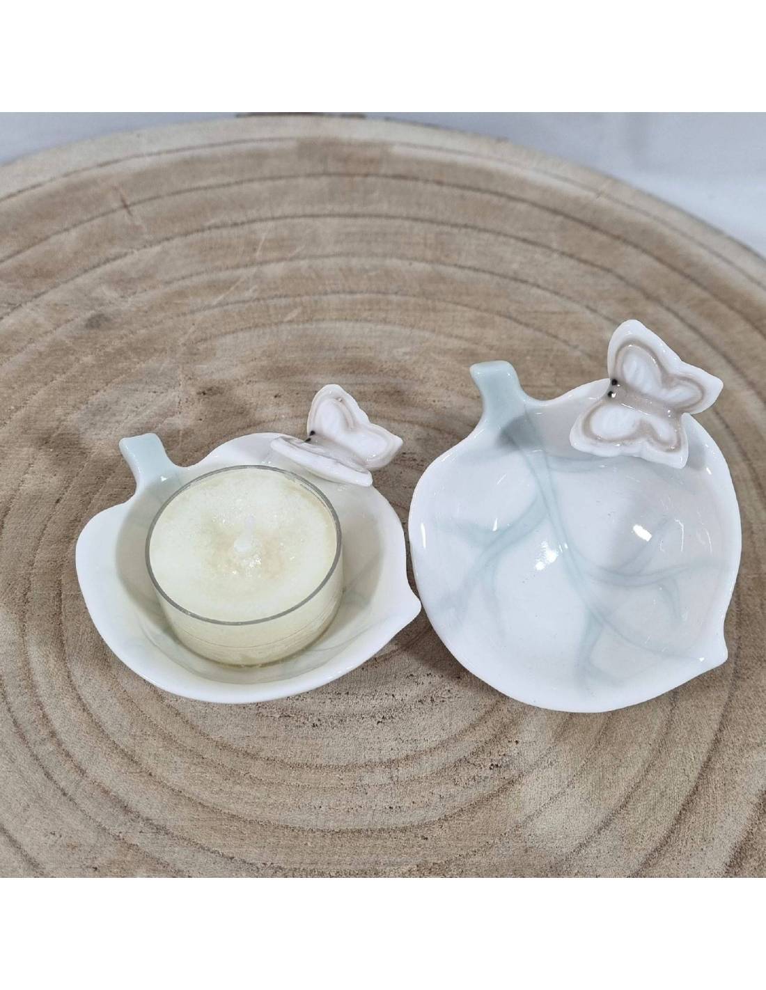 Bomboniera candela profumata porta candela in ceramica a forma di foglia con farfallina e tealight proofumate candle colorate