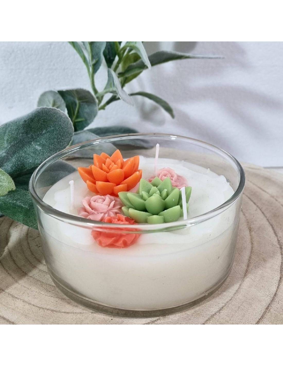 Candele profumate bomboniere vaso in vetro con piantine grasse in cera di diversi colori e fragranze.