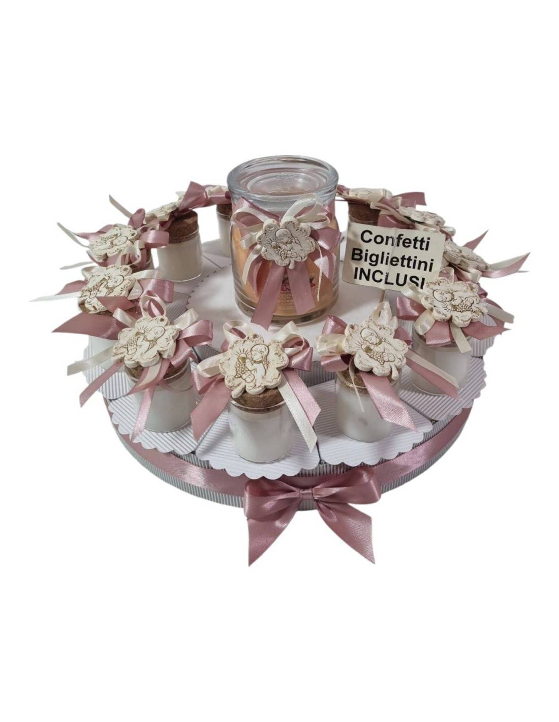 Puoi confezionare con le tue mani la torta bomboniere candele profumate calamite femmina in quanto la struttura è montata e decorata con nastri, basterà chiudere le fette e attaccare gli oggetti.