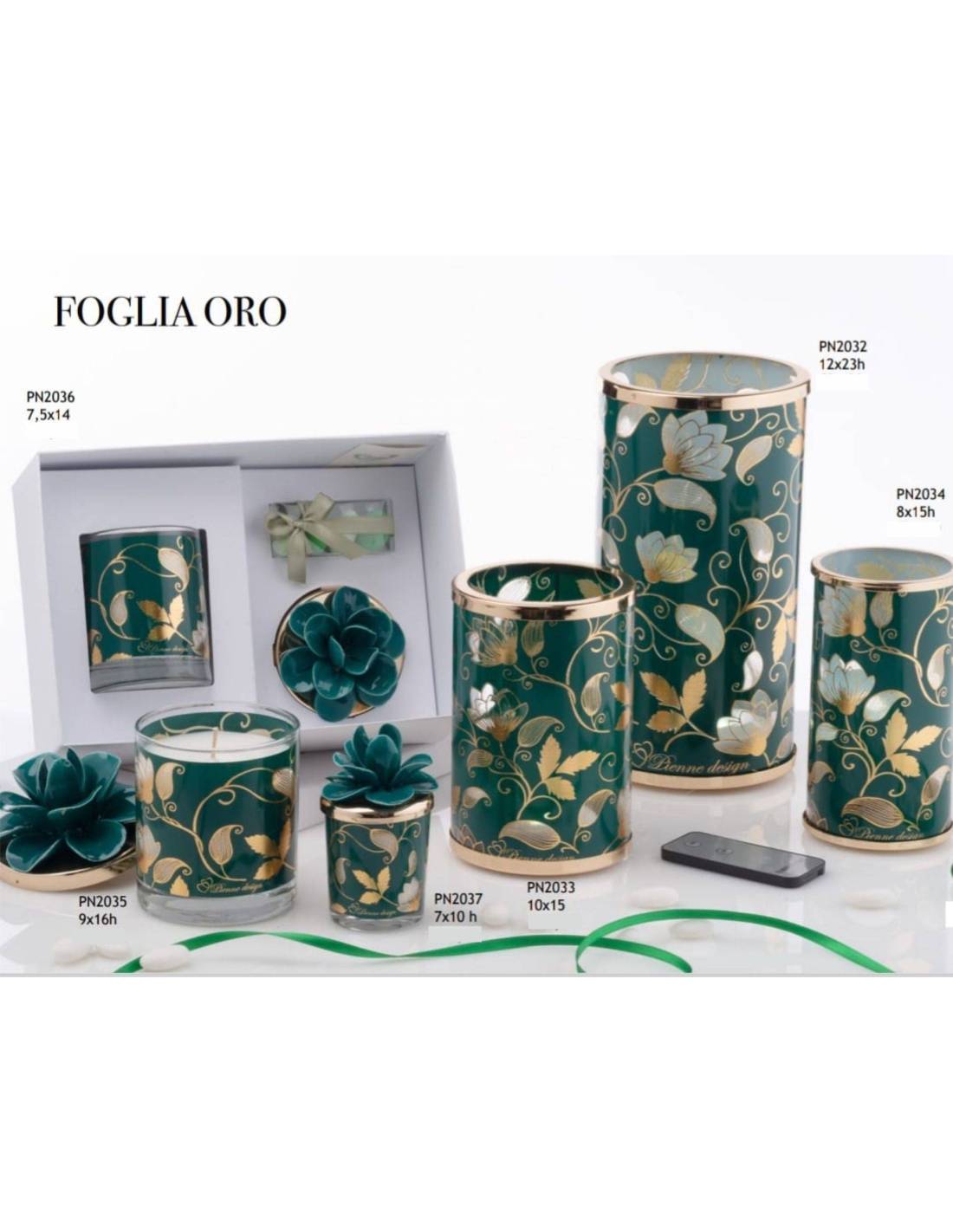Pienne bomboniere candele e lampade in vetro color verde e foglie dorate complete di scatola regalo con confezione a scelta.