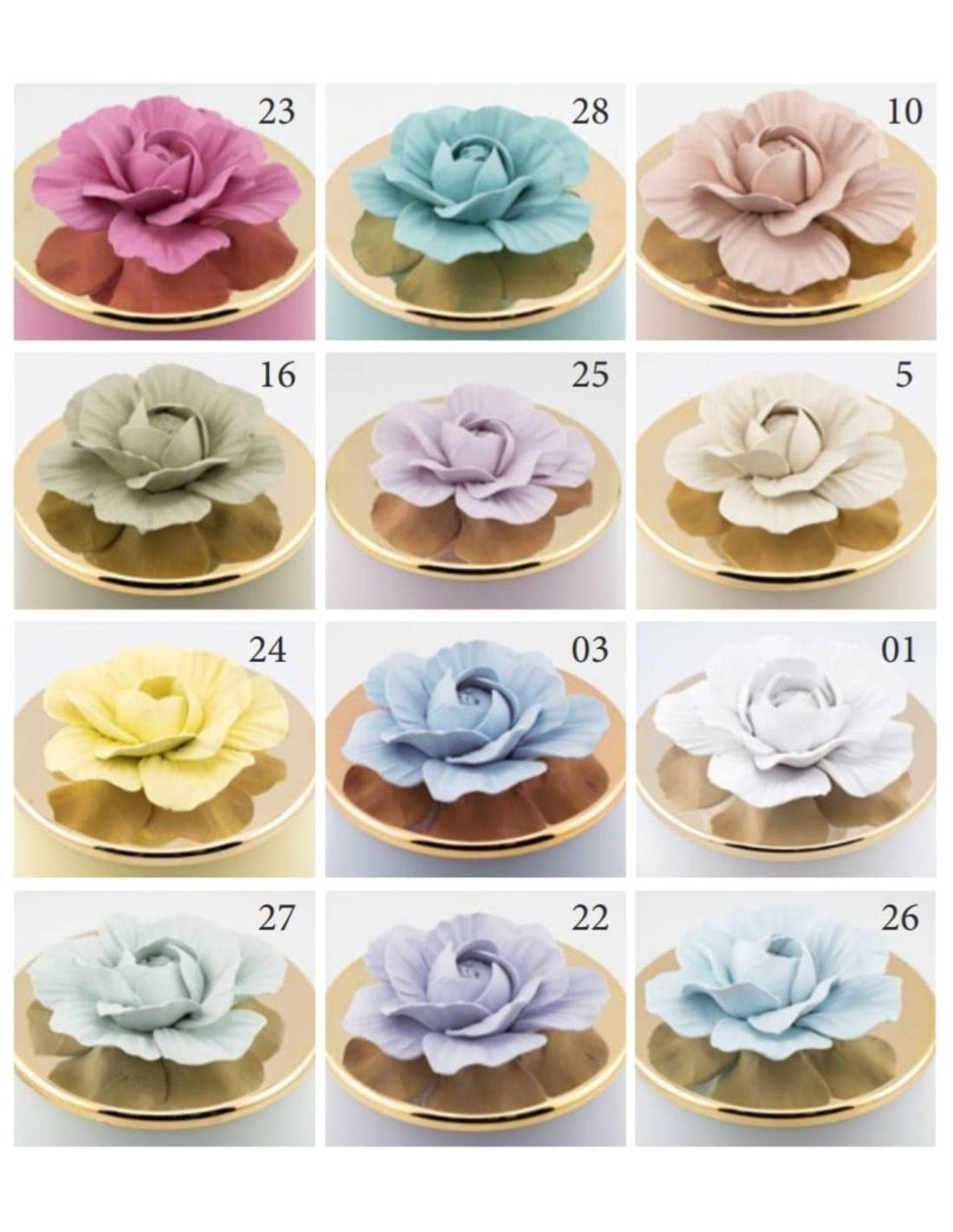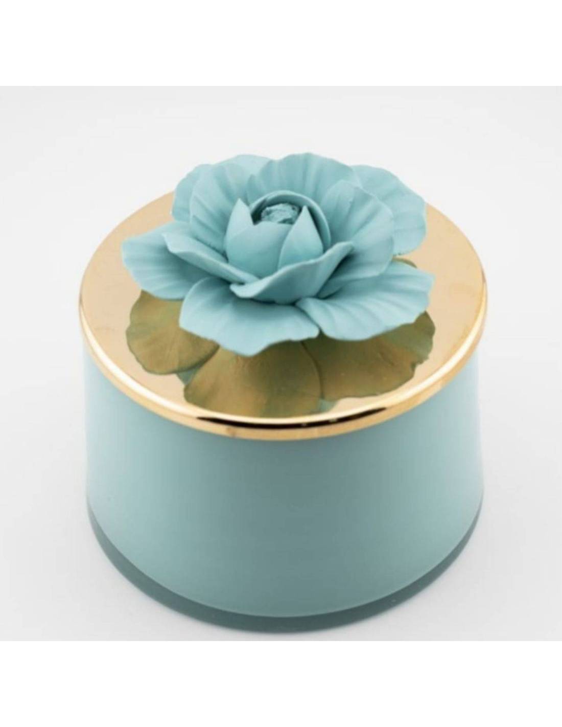 Bomboniere candele profumate vasetto in vetro con tappo in metallo dorato con rosa in ceramica satinata in tinta con il vasetto.