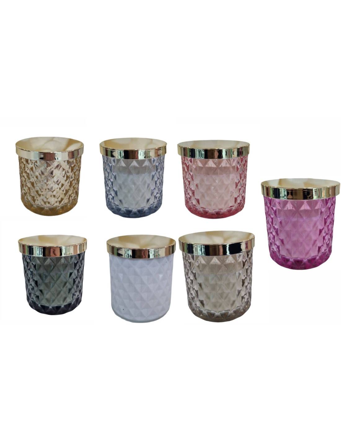 Candele bomboniere in vasetto di vetro lavorato con tappo metallo oro