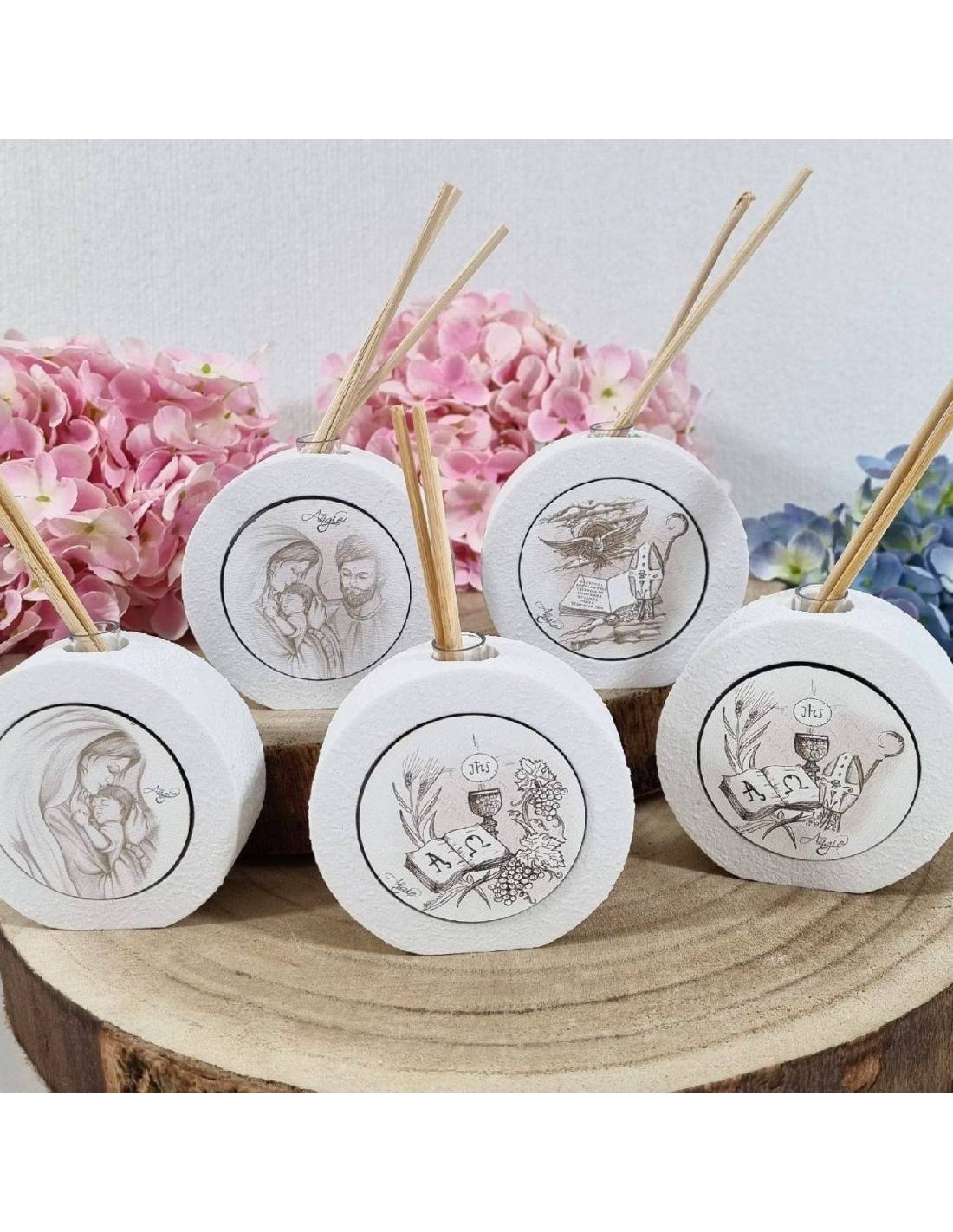 Angie bomboniere profumatori tondi stile moderno in polvere di ceramica e al centro l'immagine sacra per ogni evento.