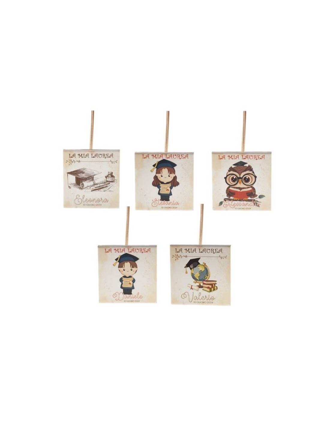Idee bomboniere Laurea profumatori personalizzati forma quadrata con stampe tema laurea.