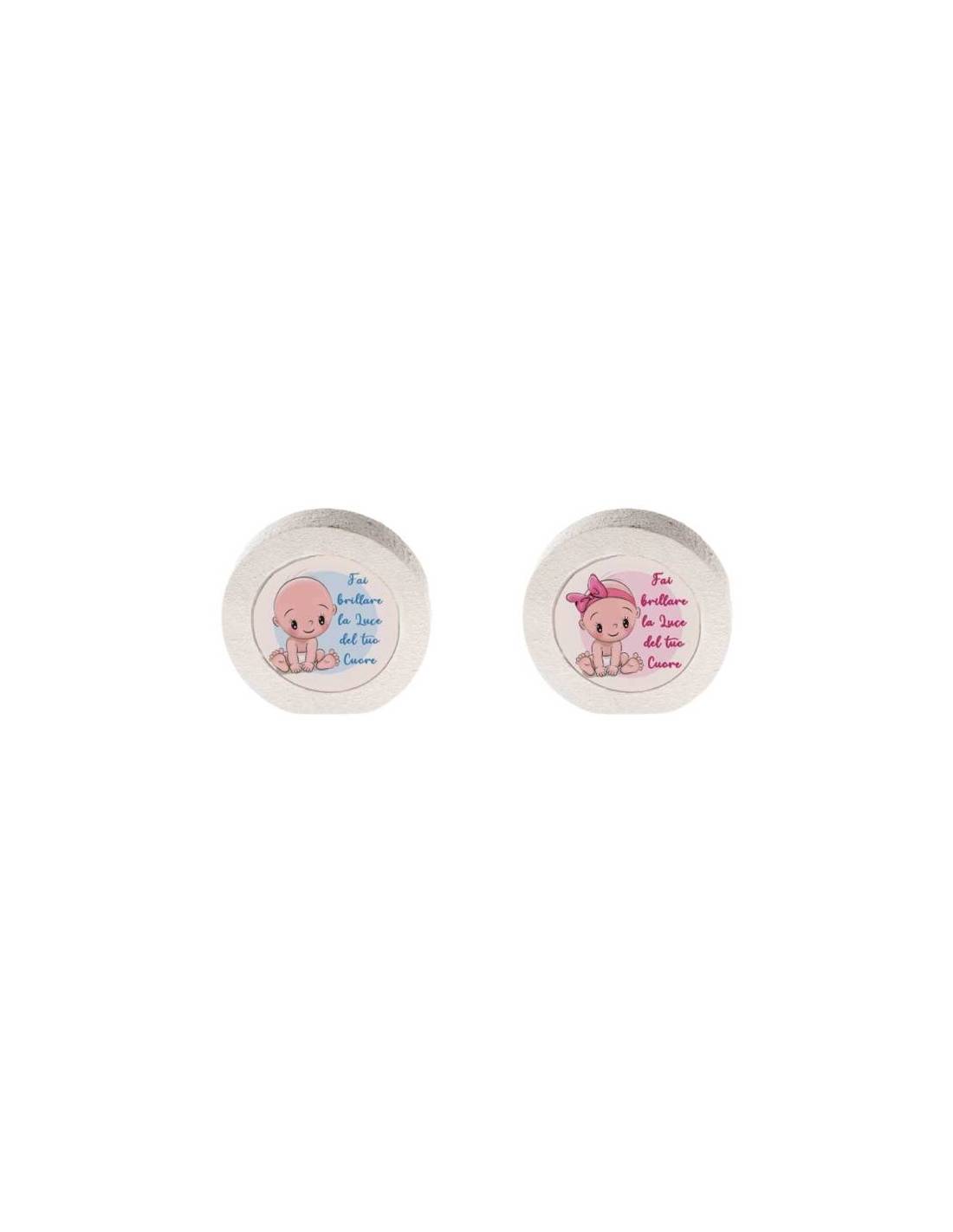 Idee bomboniere Battesimo lampada led tonda con possibilità di scelta tra versione maschio o femmina.