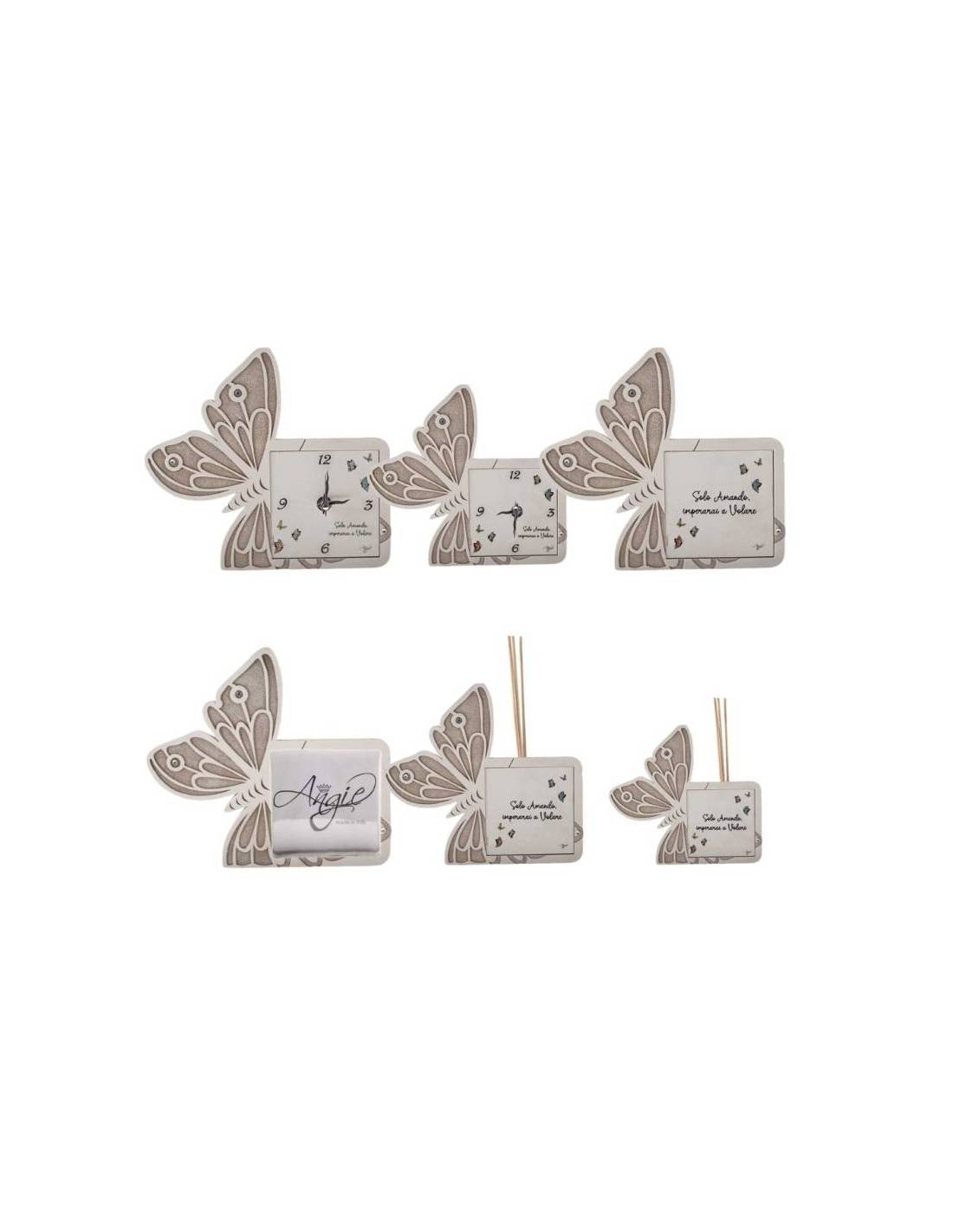 Non perderti queste farfalle bomboniere con possibilità di scelta tra orologi, portafoto e diffusori per ambienti.