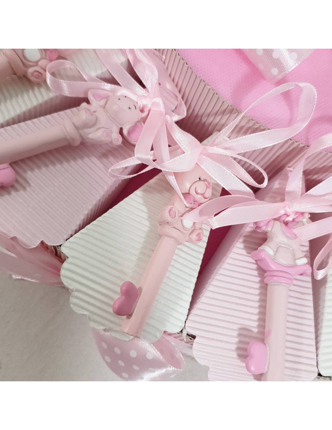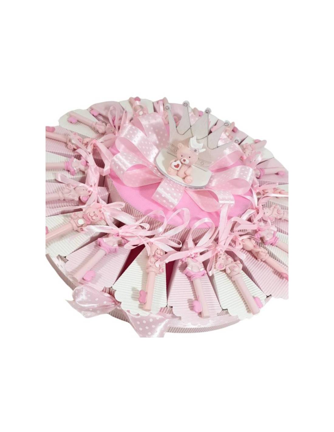 Torta di bomboniere nascita per bambina completa di confetti al cioccolato, bigliettino omaggio.