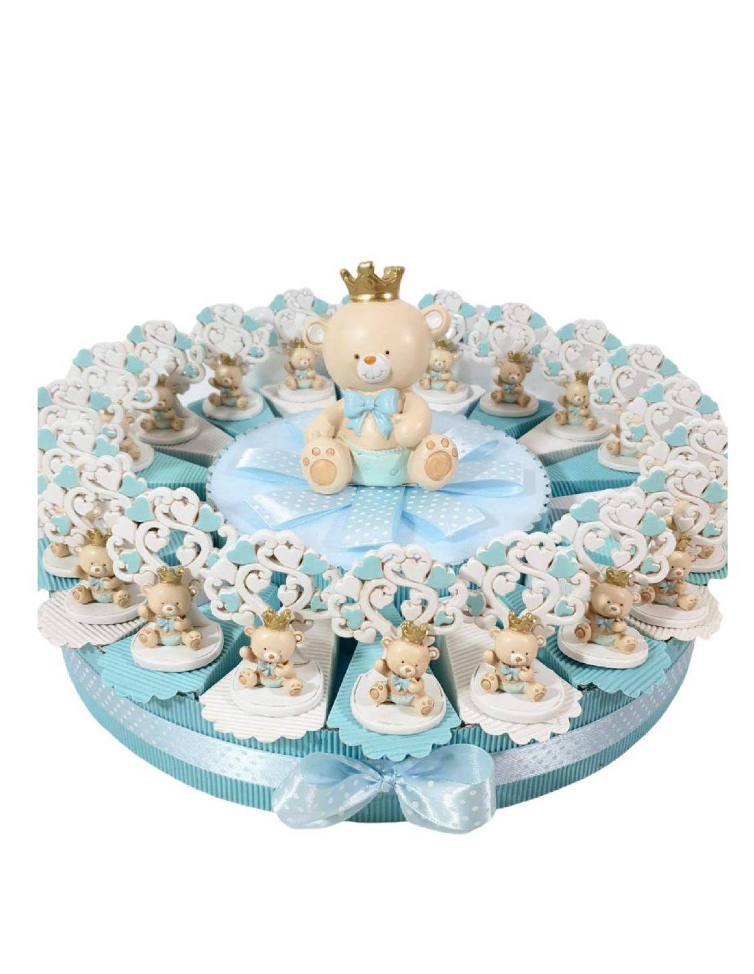 Torta bomboniera con orsetti effeto porcellana assortiti comprensivi di confetti e bigliettino. Simpatici orsetti d'appoggio in ceramica effetto porcellana lucida, alcuni orsacchiotti hanno il cappello e tra le mani hanno o la stellina, il sole, la luna, il sole... Originali bomboniere per battesimo maschietto! Centrale compreso nel...