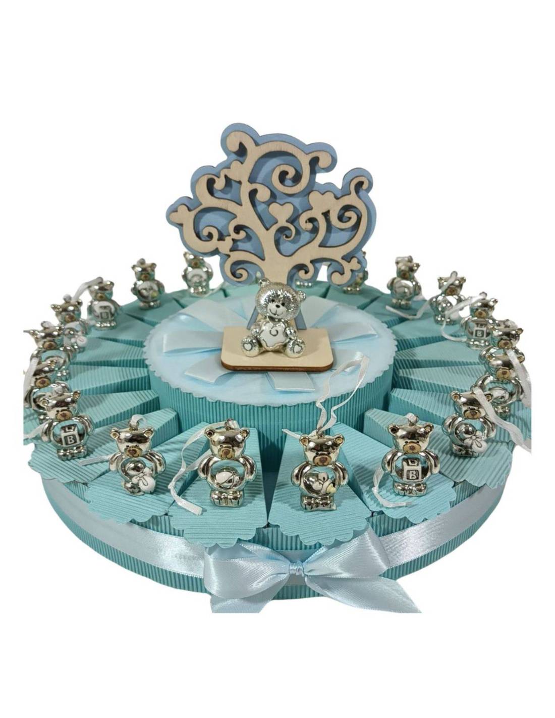Bomboniere nascita orsetti argentati torta portaconfetti offerta