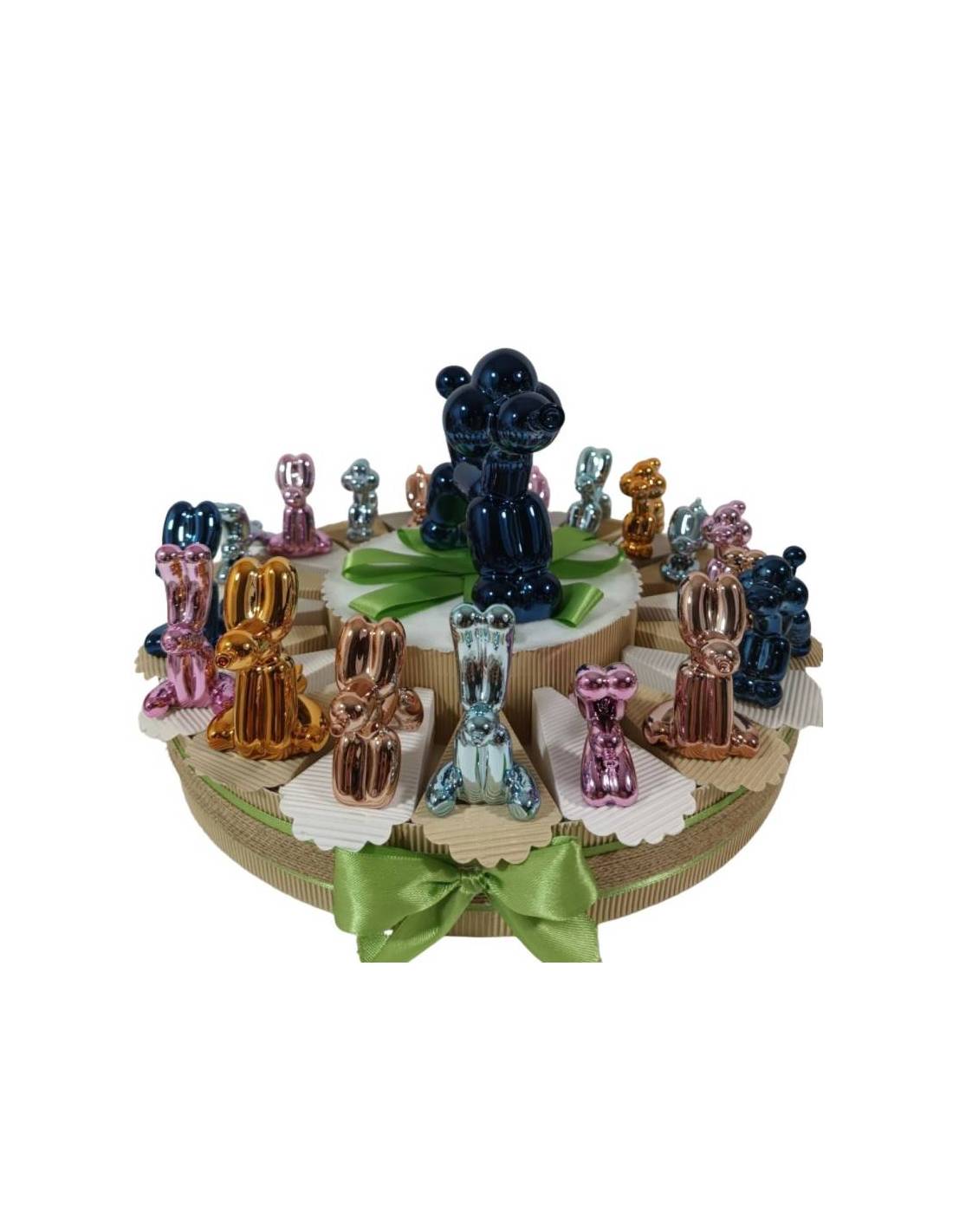 Puoi confezionare con le tue mani la torta di bomboniere fattoria statuette mucca n quanto la struttura è montata e decorata con nastri, basterà chiudere le fette e attaccare gli oggetti.