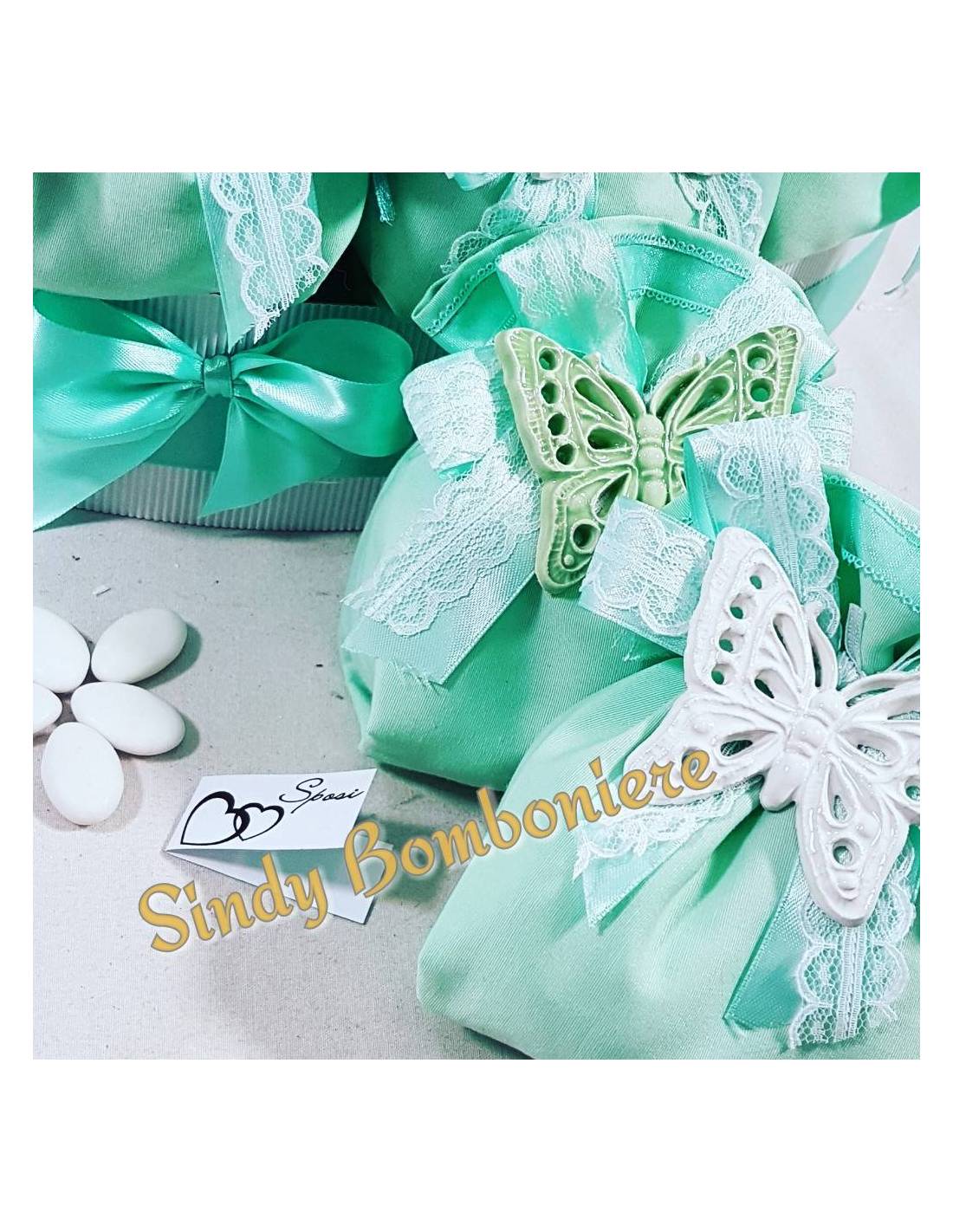 Il sacchettino è composto anche da una graziosa FARFALLA in ceramica di Grottaglie accuratamente traforata sulle ali e tinta di verde (Dimensione: 6,5 x 6 cm circa)