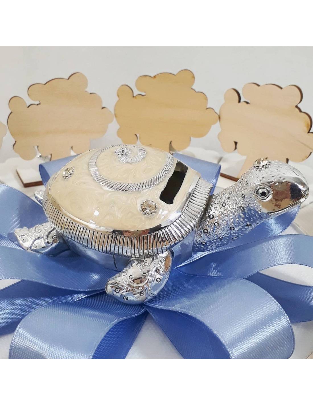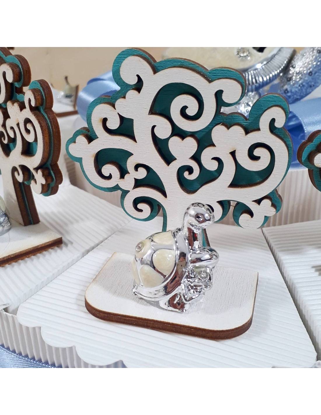 La struttura è composta da fette in cartoncino contenenti i 5 confetti della tradizione, sigillati all'interno di un blister per alimentari, e il bigliettino personalizzato. Su ogni fetta è presente un bellissimo albero della vita da appoggio in legno con su applicata una tartarughina con strass sul guscio. Il tutto è arricchito con una centrale salvadanaio a forma di tartaruga con guscio effetto madreperla