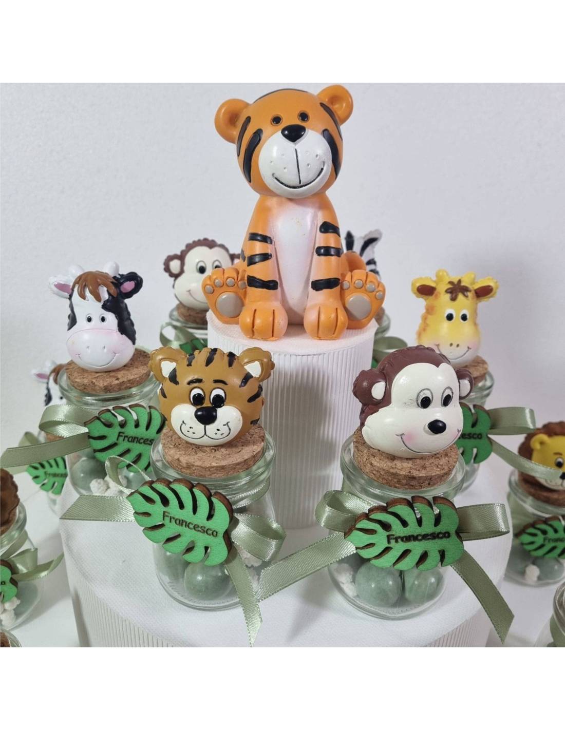 Su ogni vasetto bomboniera Battesimo c'è un animaletto che rappresenta la scimmia, la tigre, il leone, la zebra, la mucca completi di 5 confetti.