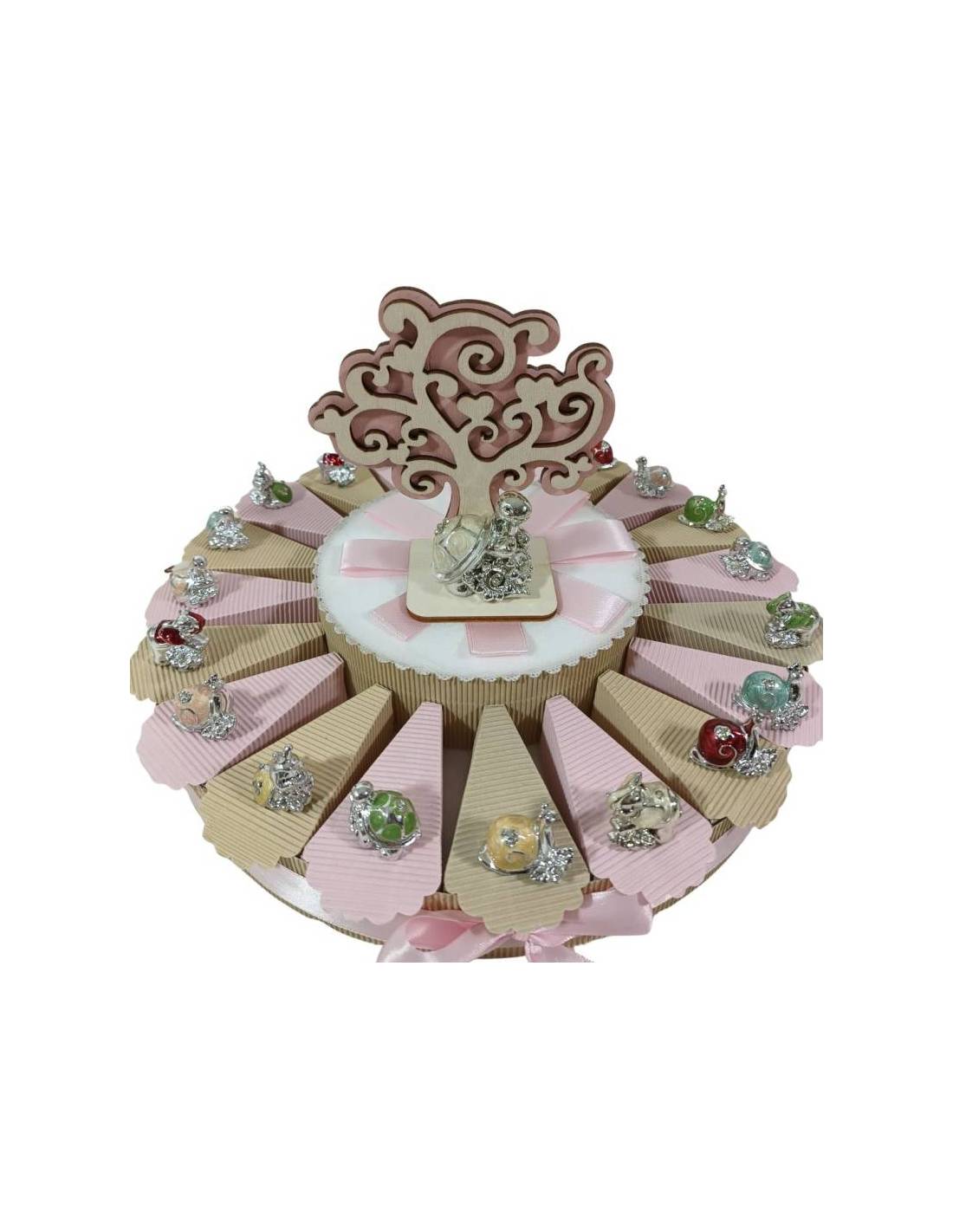 Puoi confezionare con le tue mani le bomboniere torta animaletti argentati in quanto la struttura è montata e decorata con nastri, basterà chiudere le fette e attaccare gli oggetti.