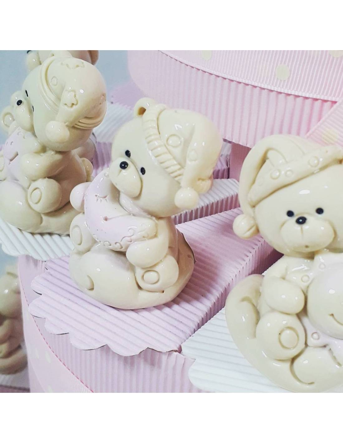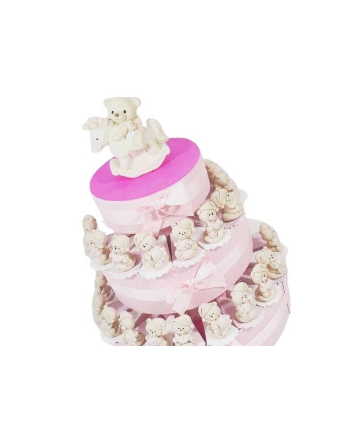 Torta bomboniera con orsetti rosa effeto porcellana assortiti con fette in cartoncino comprensivi di confetti e bigliettino. Simpatici orsetti d'appoggio in ceramica effetto porcellana lucida, alcuni orsacchiotti hanno il cappello e tra le mani hanno o la stellina, il sole, la luna, il sole...