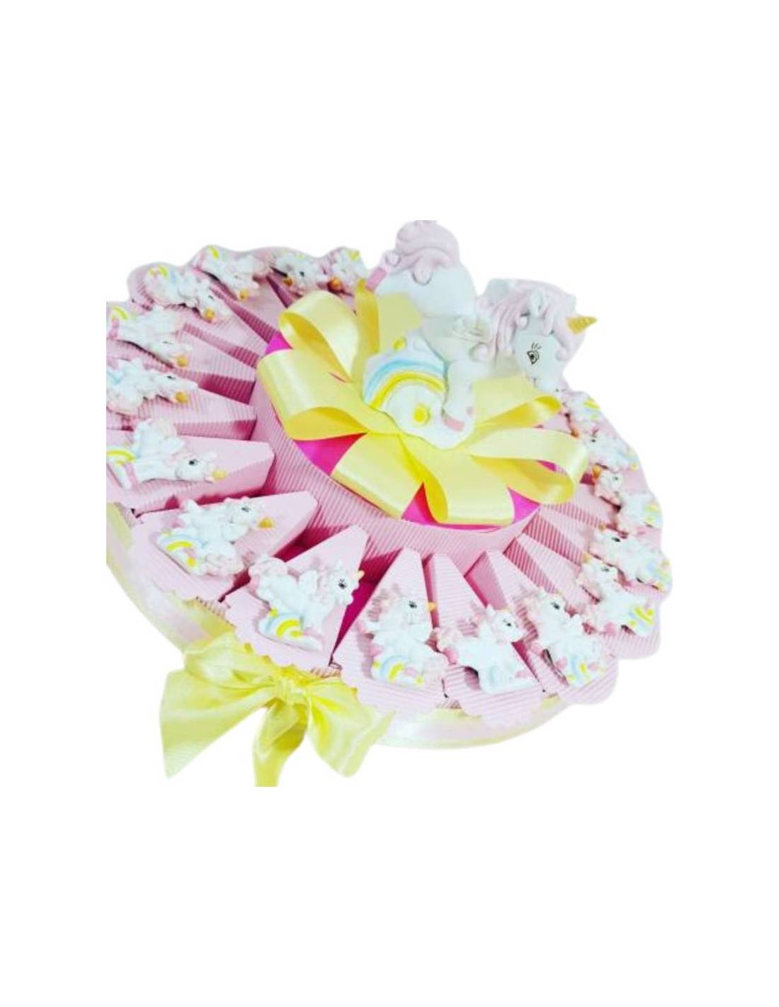 Bomboniere a forma di torta per femminuccia, con magnete unicorno. Bomboniere economiche unicorno curati nei minimi particolari da disporre sulla torta portaconfetti come in foto. La torta arriverà montata e decorata con nastri come in foto, ma le fette verranno inserite da voi , facili da chiudere inserendo i confetti (5 confetti al cioccolato in blister per alimenti sigillato da una macchina confezionatrice IGIENE AL 100%) e poi con un pò di colla potete attaccare gli oggetti autonomamente (Consigliamo colla a caldo, colla tipo attack o biadesivo), tutto questo per garantire l'integrità del prodotto.
