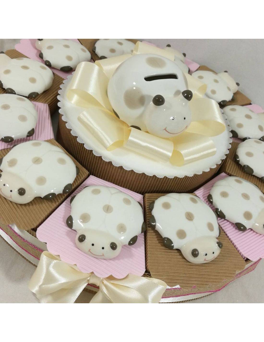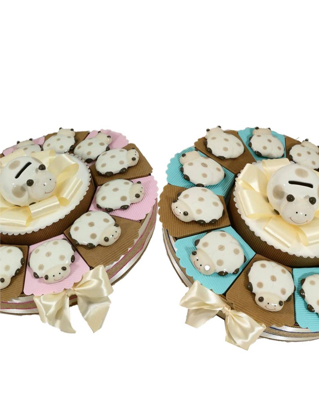 Puoi acquistare la torta bomboniera fai da te molto facile da confezionare con le tue mani. Infatti è già montata e decorata con nastri, dovrai chiudere le fette e attaccare gli oggetti.
