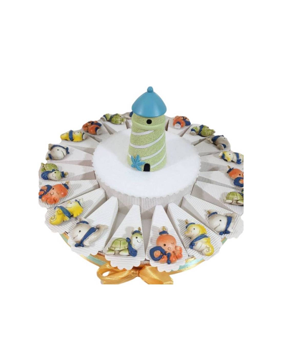 Puoi confezionare con le tue mani la torta bomboniera cavallucci e stelle marine in quanto la struttura è montata e decorata con nastri, basterà chiudere le fette e...