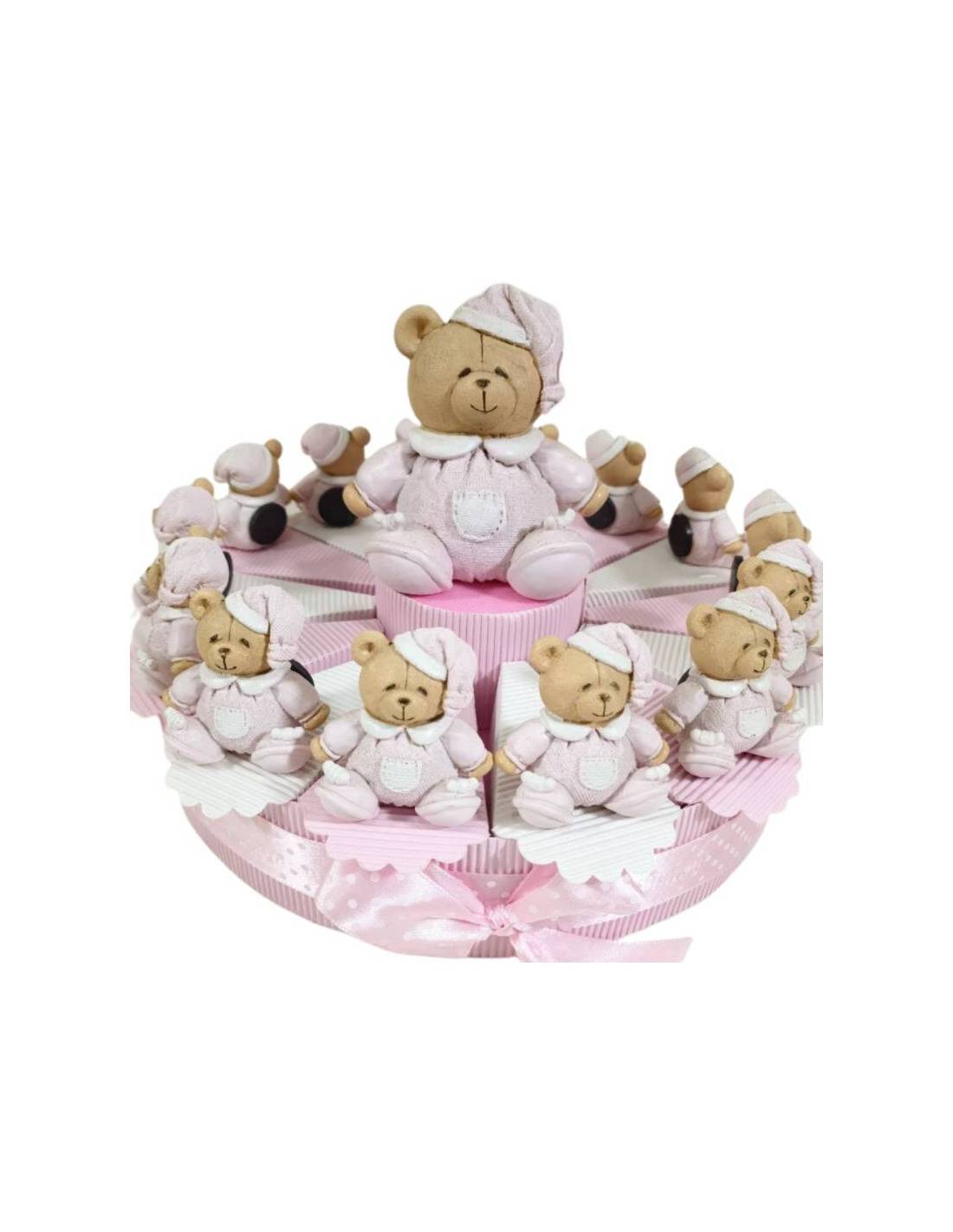 Torta di bomboniere con questi dolcissimi orsetti che hanno la tutina con il cappello da notte rosa.