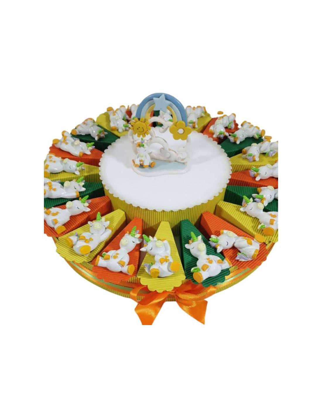 TORTA Bomboniere unicorno colore arancione e verde.
