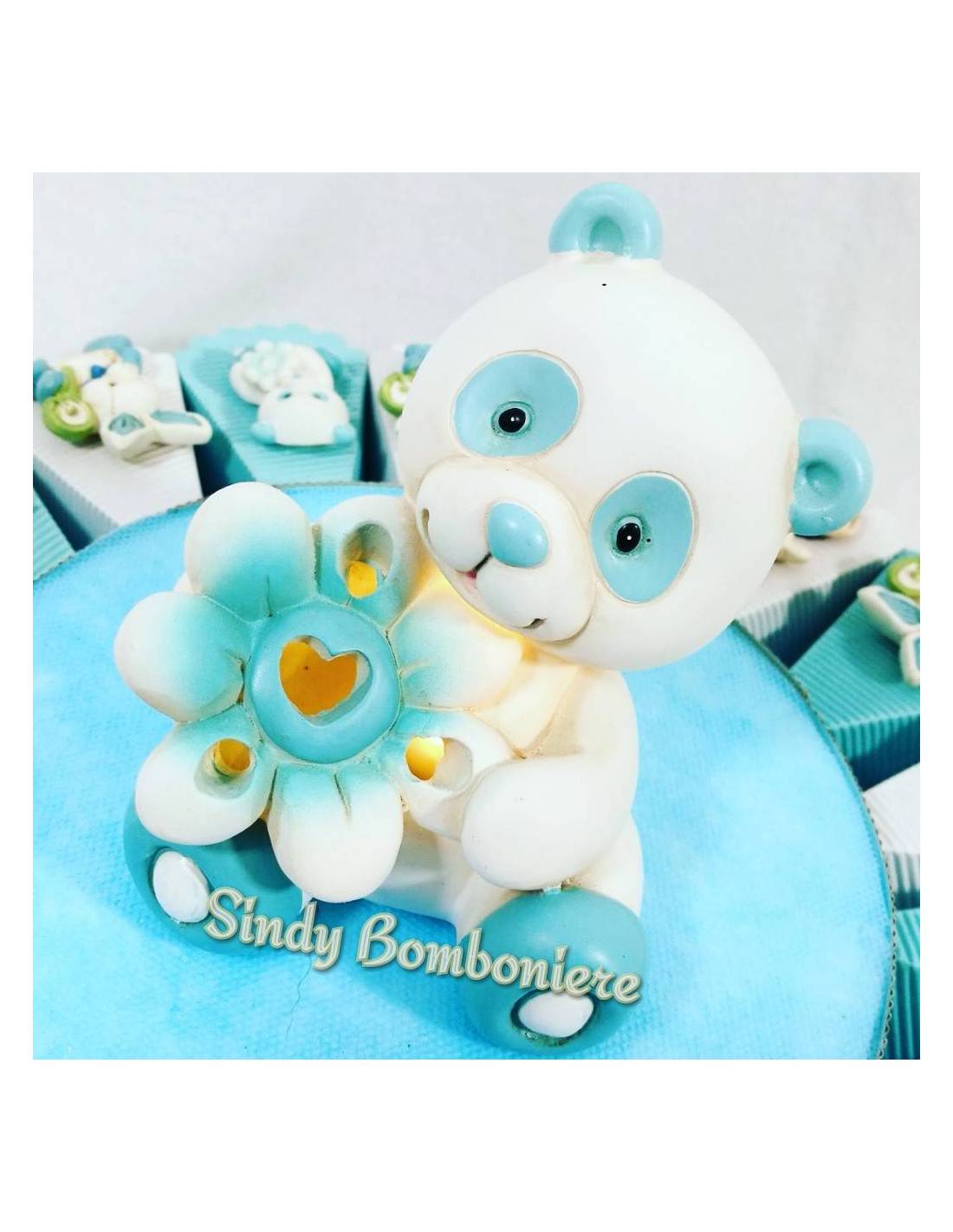 + CENTRALE ORSETTO bimbo seduto bianco con particolari azzurri con tra le mani una lampada funzionante a forma di fiore con foro a forma di cuoricino