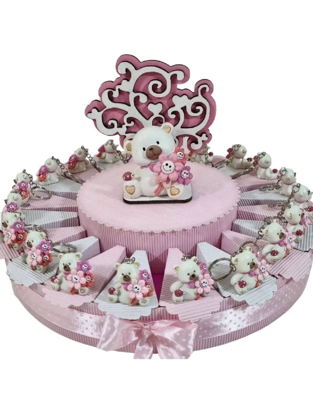 TORTA BOMBONIERA ORSETTO PORTACHIAVI ROSA CON FIORELLINI IN MANO NASCITA BATTESIMO COMUNIONE CRESIMA COMPLEANNO