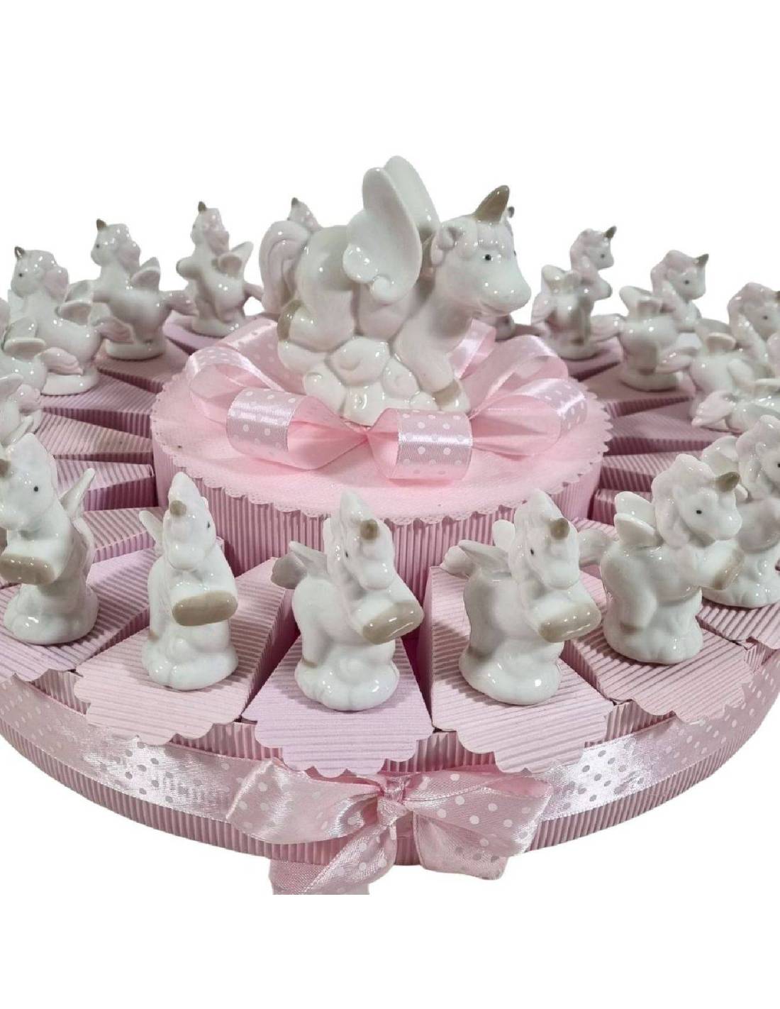 Bomboniere unicorno porcellana bianca con dettagli rosa a torta portaconfetti.