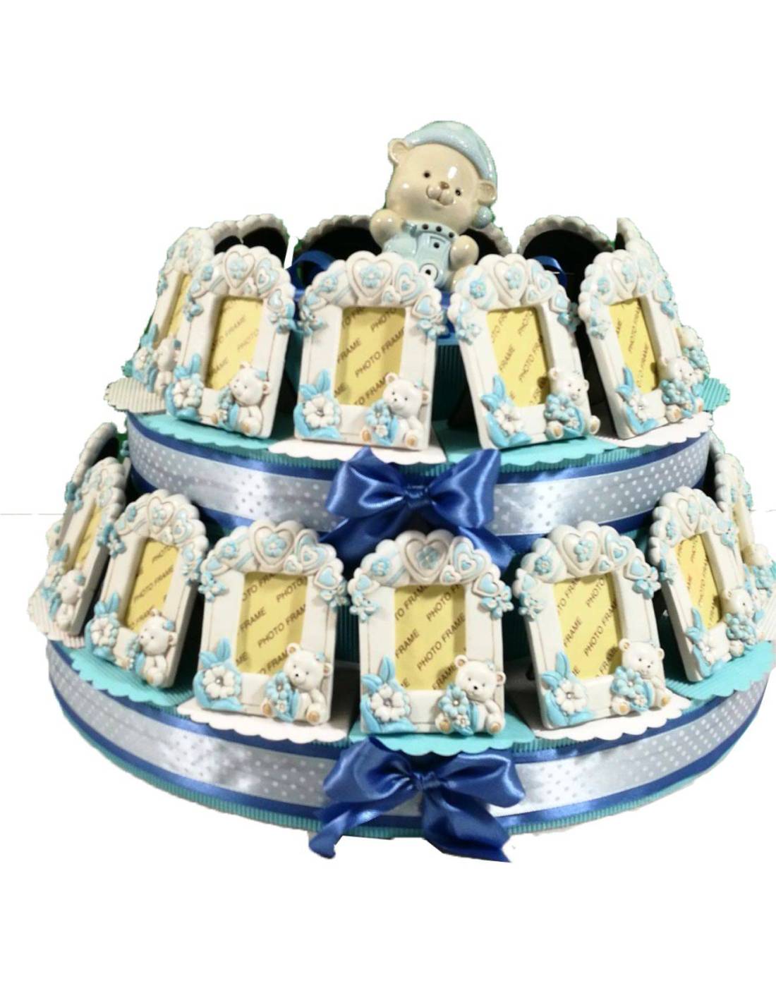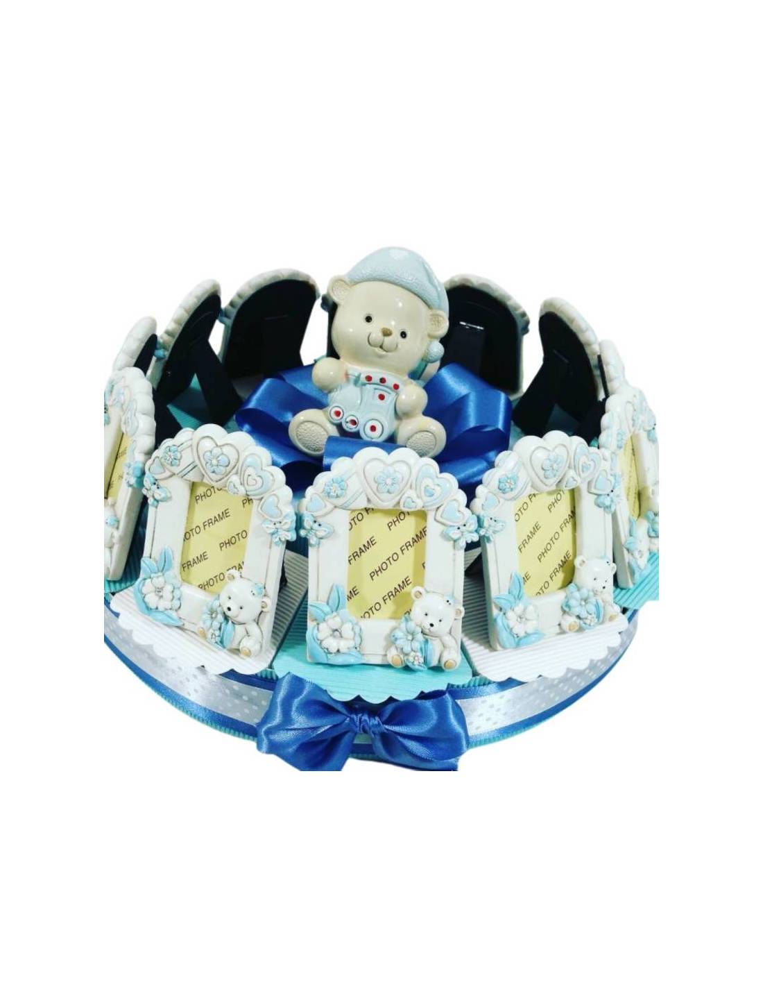 Portafoto orsetto confezionati a torta bomboniera per Battesimo curati in tutti i dettagli, hanno cuori e fiori in rilievo dai colori delle tonalità del celeste.
