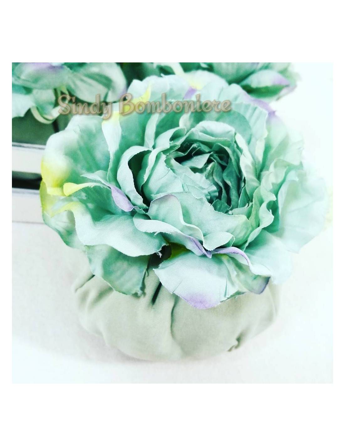 Portaconfetti verde acqua con chiusura a puff e incastrata all'interno la peonia proprio con questo colore matrimonio di quest'anno. Infatti Enzo Miccio ha creato e firmato i confetti Maxtris con nuance tiffany di colore per creare sacchetti portaconfetti sposi