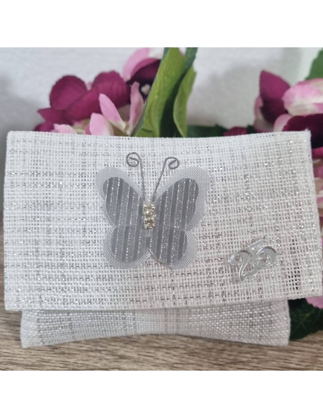 Sacchetti portaconfetti 25 anniversario laminati argento e decorati con farfalla e 25 in plexiglas argentato.