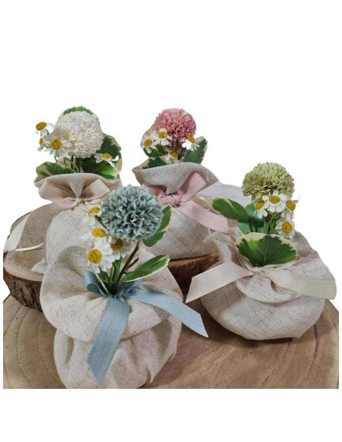 Sacchetti bomboniere in lino morbido decorati con fiocco in stoffa con mazzetto di fiori.