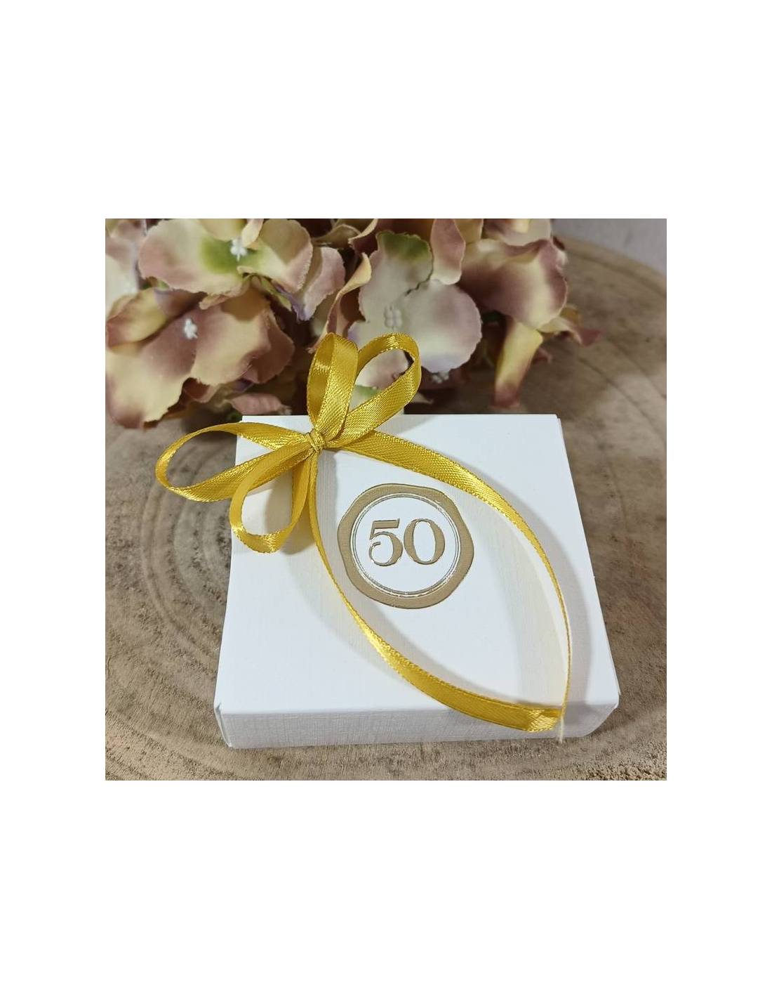 Scatole per degustazione confetti in cartoncino bianco con numero 50 dorato e nastrino in raso abbinato ideale per evento 50° Anniversario Matrimonio.