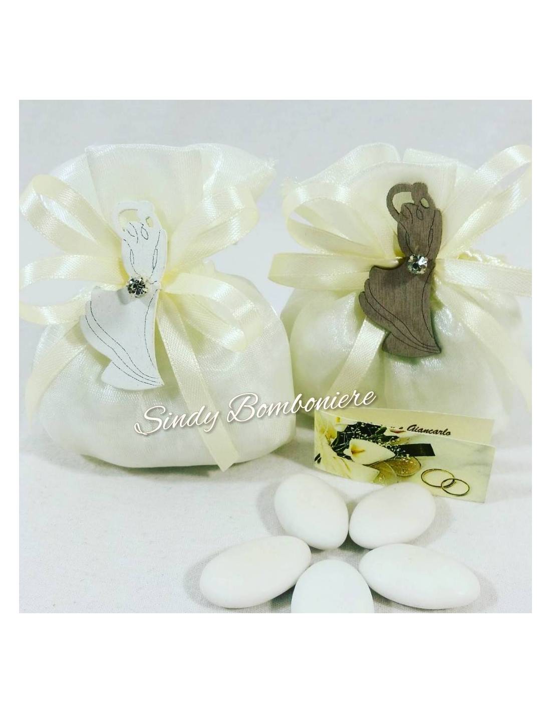 sacchettini bianchi, chiusi con nastrino panna e arricchito di applicazione in legno assortiti in due varianti di due colori differenti: bianco e marrone che raffigura una coppia di sposi che si abbraccia.