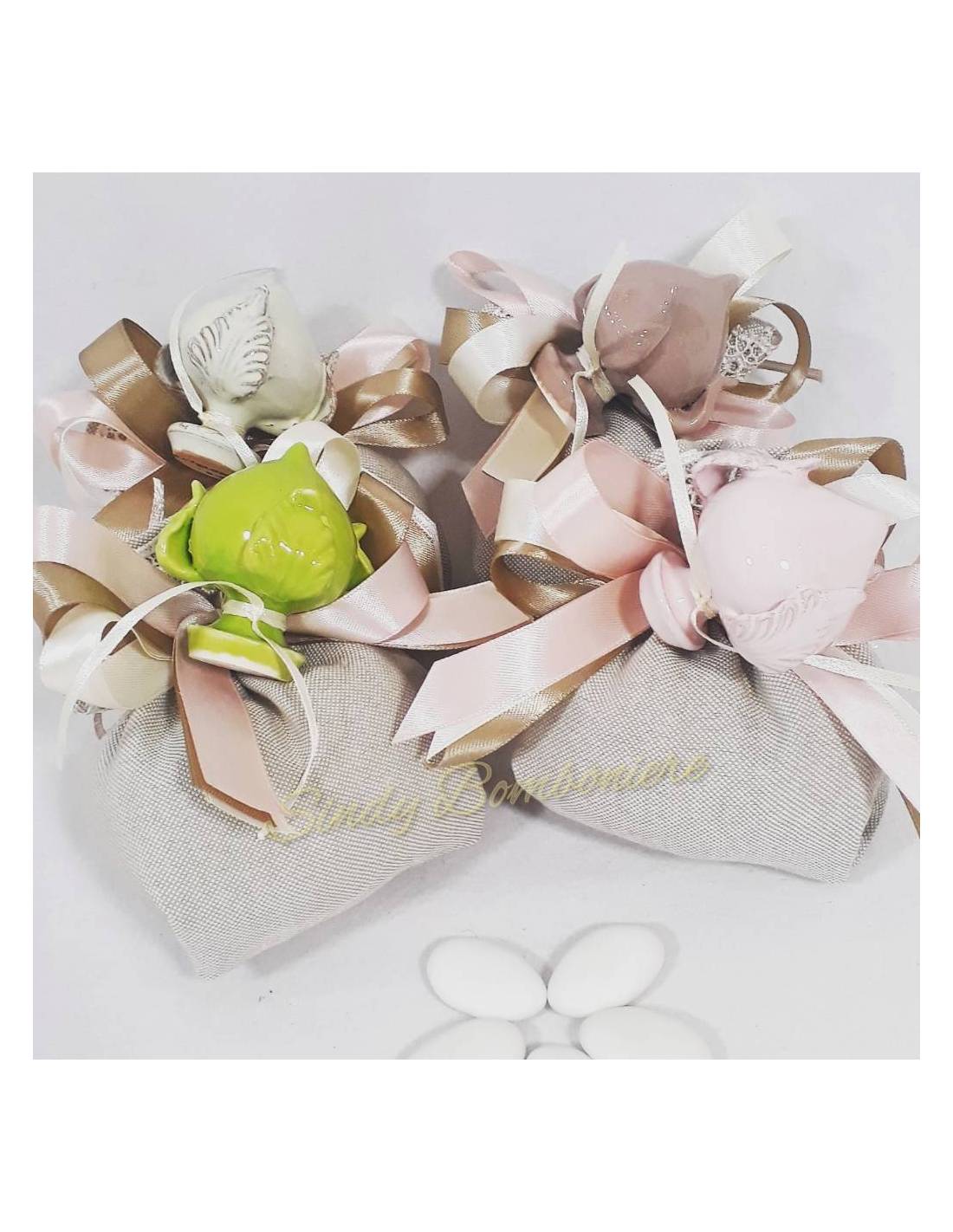 Bomboniera confezionata sacchetti in cotone con pumo in ceramica per cresima e comunione