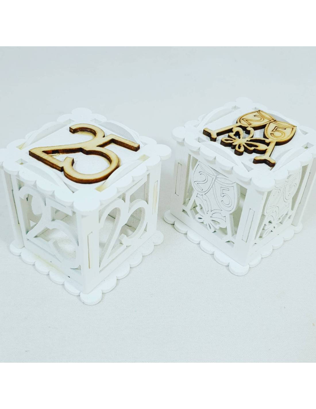 Scatolina portaconfetti in legno a forma cubica traforato 25° anniversario di matrimonio 412572