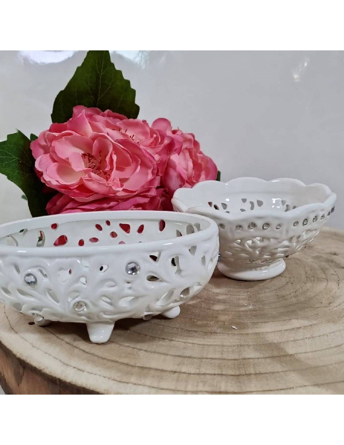 Bomboniere matrimonio ceramica scatole portaoggetti in ceramica lucida bianca traforata e decorate con strass.