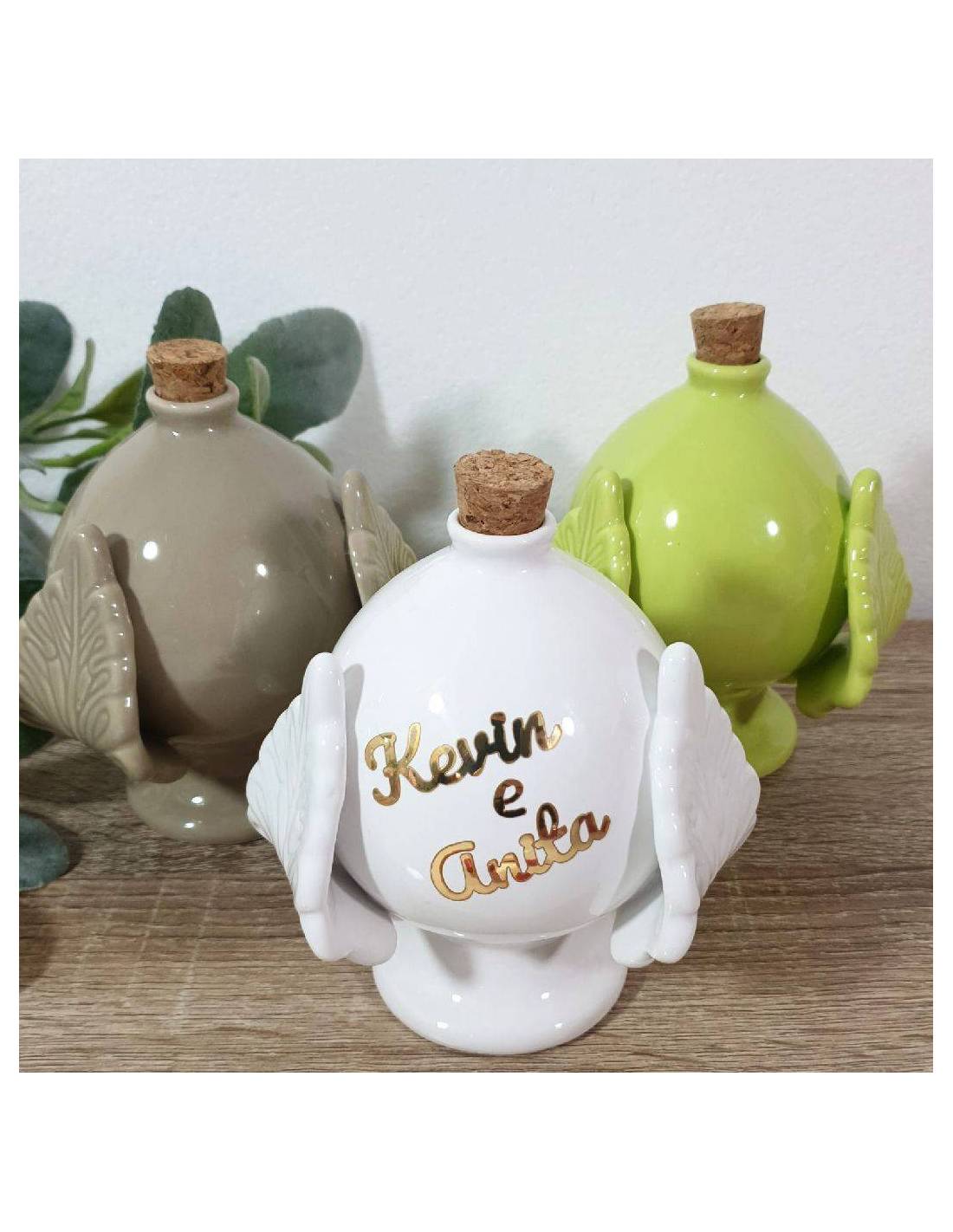 Oliere bomboniere pumo in ceramica con nomi sposi dorati e tappo in sughero.