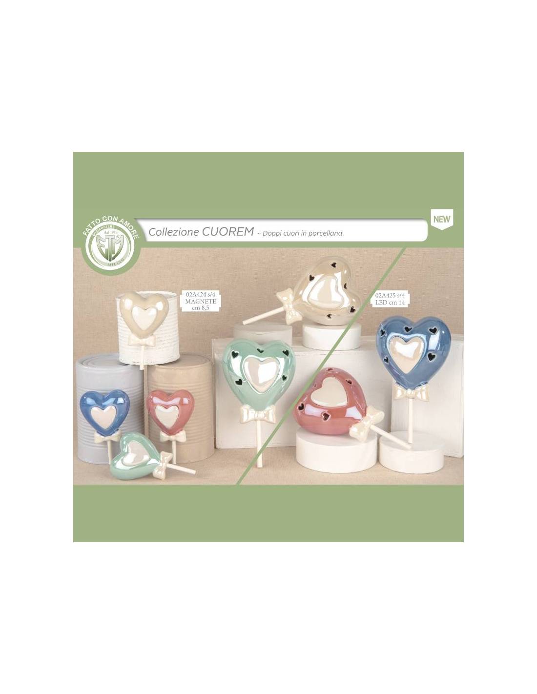 Lampada led bomboniera in porcellana lucida a forma di borsette colorate con fori a forma di cuori.