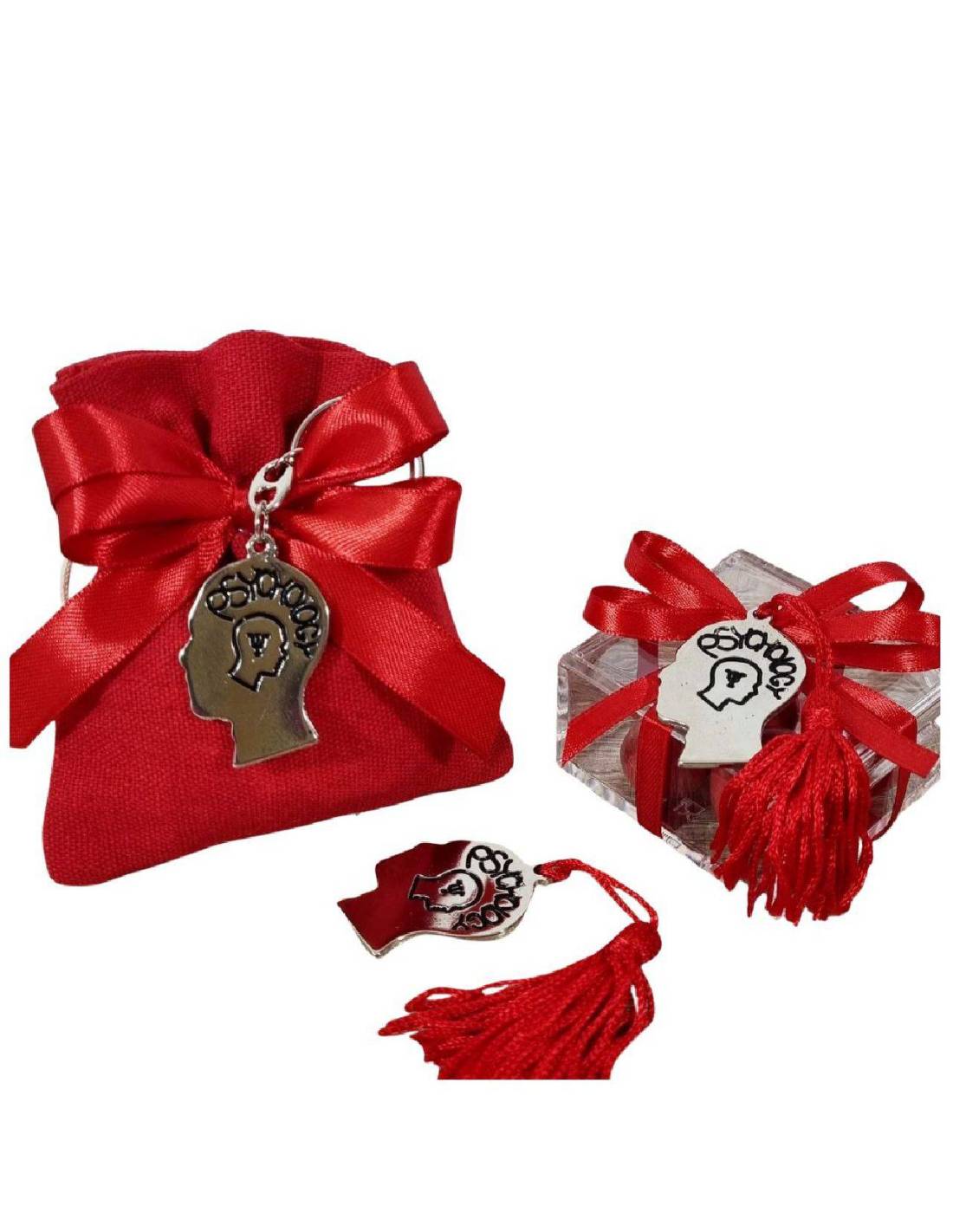 Bomboniere laurea candela completi di fiocco in raso e nome del festeggiato completi di sacchettino in tulle con 5 confetti.