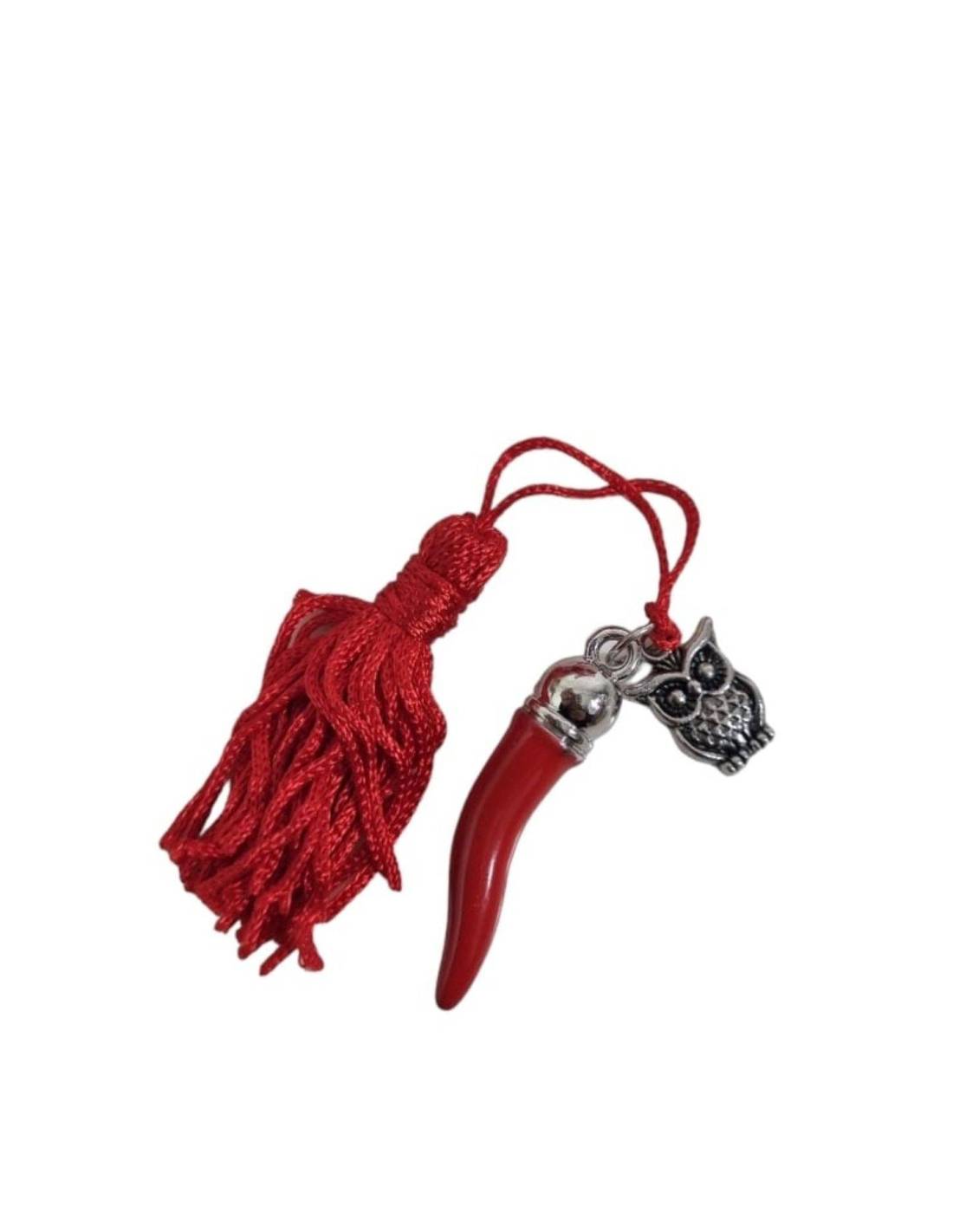 Bomboniere laurea con ciondolo a corno in acciaio e smalto rosso lucido con gufetto e nappa rossa.