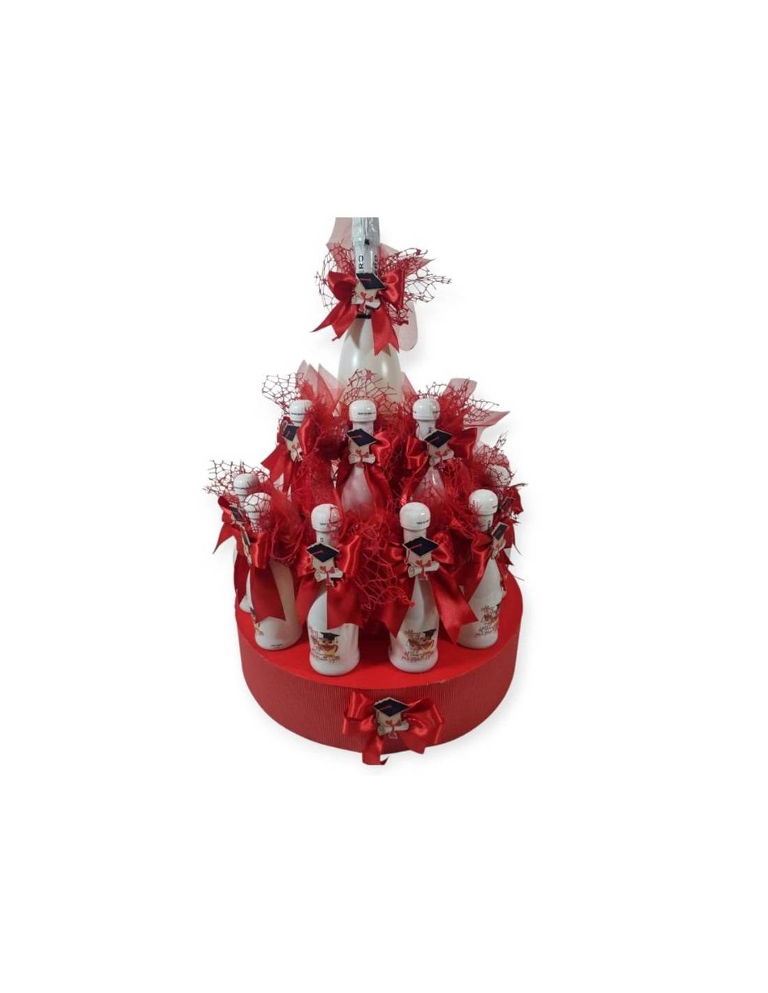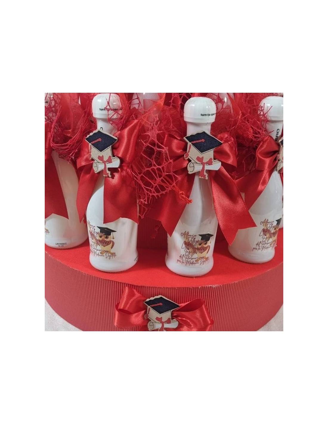 Idee bomboniere Laurea mini bottiglie Santero bianche con gufetto laureando e decoro fiocco rosso in raso chiudinodo tocco e tesi.