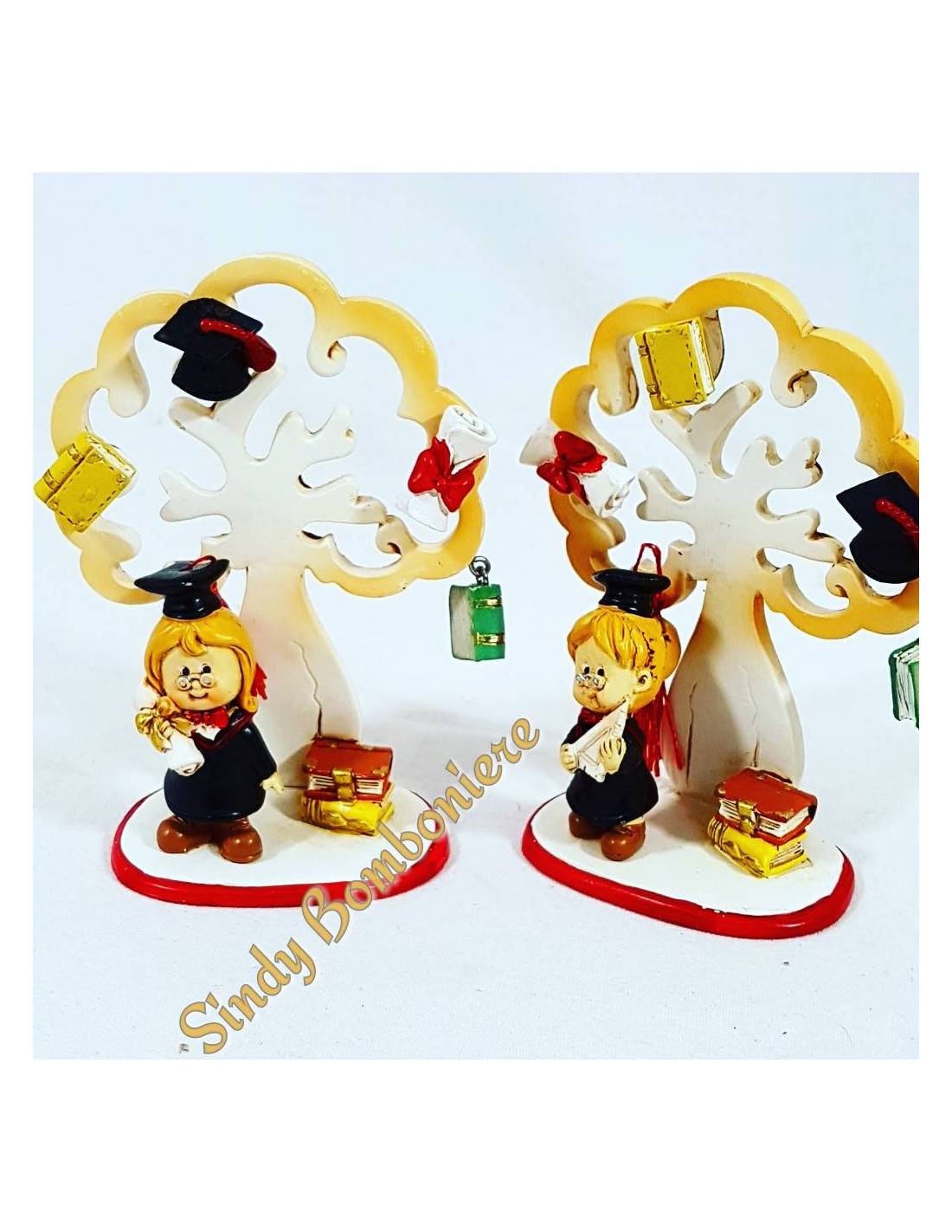 La bomboniera è composta dall'albero della vita bianco e chioma con tonalità di giallo e venature sul tronco. Sulla chioma sono inseriti dei magneti (pergamena, libro giallo e verde, tocco). Inoltre vicino all'albero vi è anche una ragazza laureata assortita tra: ragazza con capelli lisci e pergamena in mano e ragazza con coda e squadra in mano. Infine accanto alla ragazza laureata vi sono due libri appoggiati l'uno marrone sull'altro giallo.