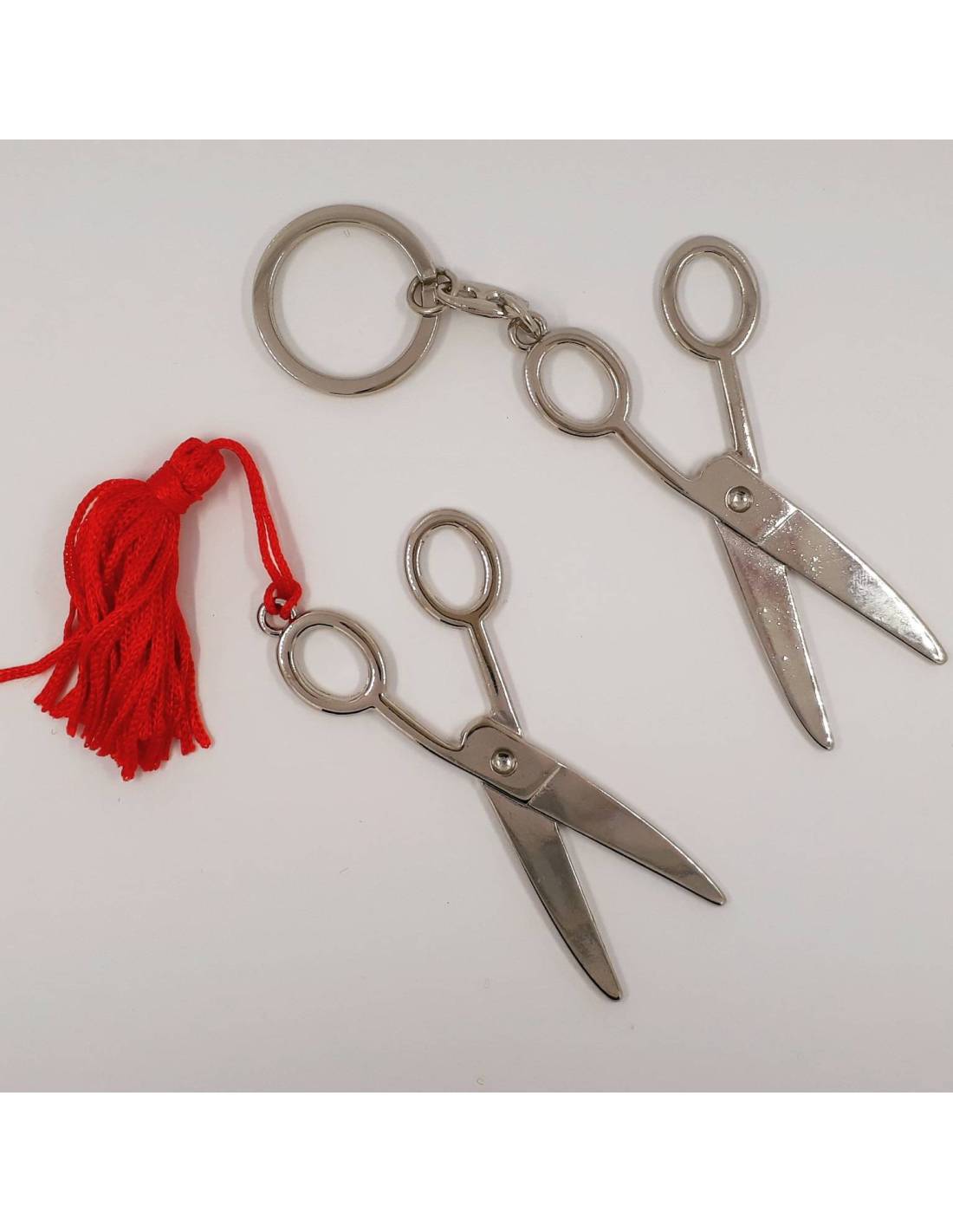 Forbice in microfusione zama con nappina color argento antico. Adatto per confezionare bomboniere fai da te a tema laurea.